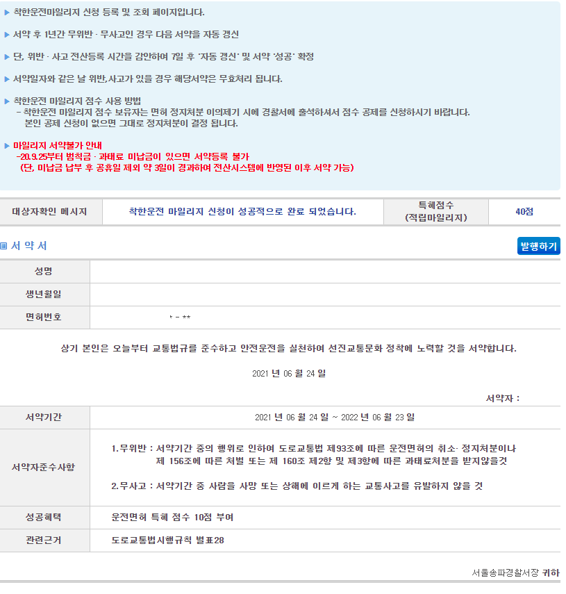 · 서약 횟수에 제한은 없으며, 해마다 무 위반, 무사고 서약을 하고 지키면 마일리지가 10점씩 계속 누적됩니다.