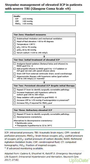 Level II—Begin treatment when ICP > 20 mm Hg Level III—Management of ICPs requires evaluation of clinical examination, ICP measurement, and imaging findings |