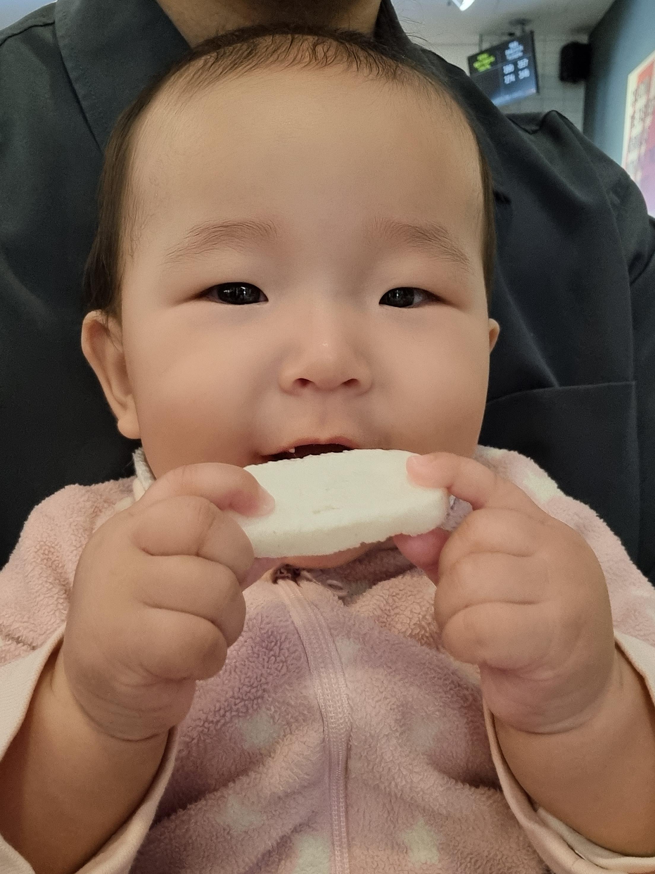 조그마한 손으로 과자를 잡고 이리저리 돌려가며 빨아 먹는 모습이 매우 귀엽다