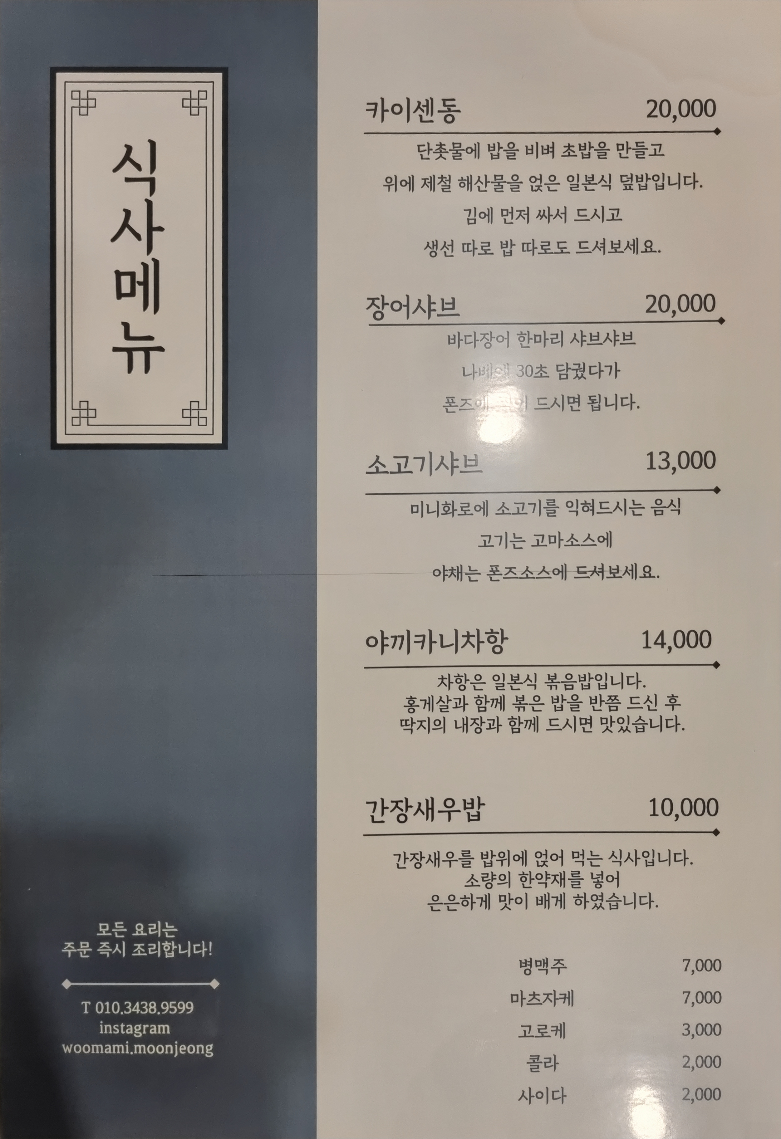 | 청담동 주방장 출신 요리사가 운영하는 일인 매장입니다. 점심에는 카이센동 등 식사류를 판매하고 저녁에는 술과 안주류를 팔고 있습니다. 11월 중 저녁에는 오마카세로 전환 예정입니다. |