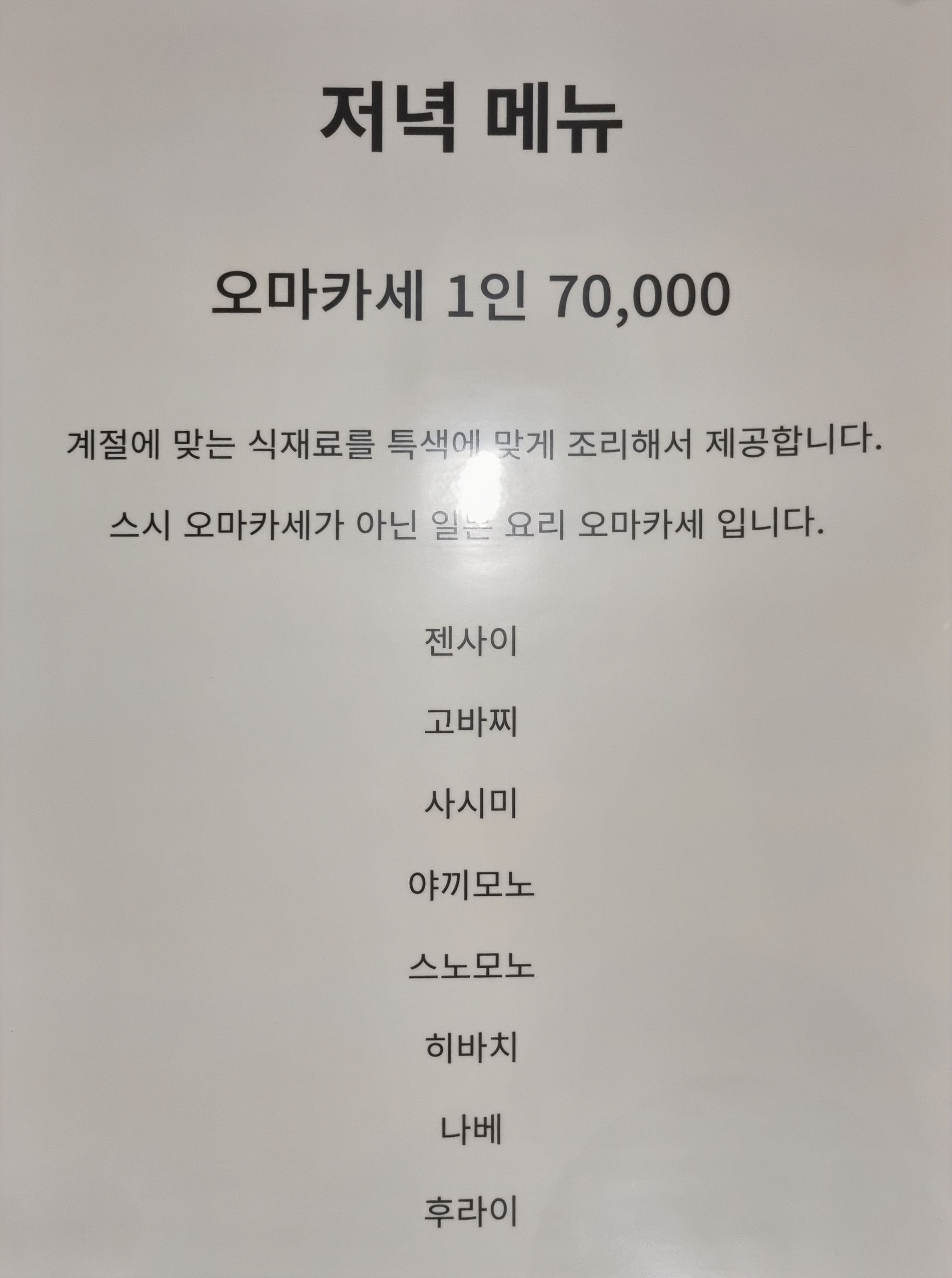 1인당 70,000원이었고, 물론 그때그때마다 나오는 것은 다르며, 예약을 하였을 때 미리 음식 알레르기나 취향을 알려주면 맞춰 해주신다고 하였다.