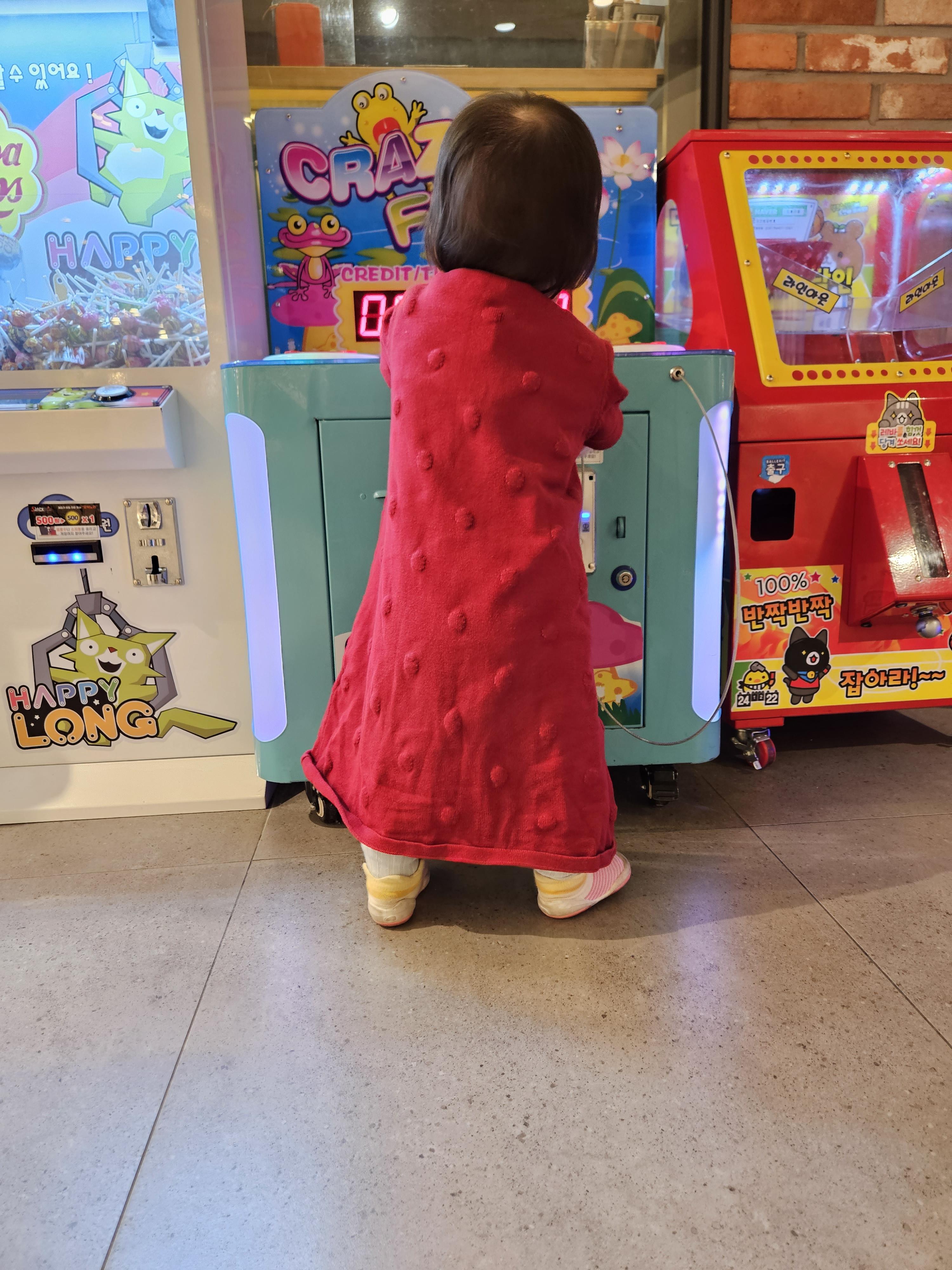 뽑기 잘 할 수 있다며 한 번만 하게 해달라고 해서 천원 주었더니, 집중해서 하려고 하더라..