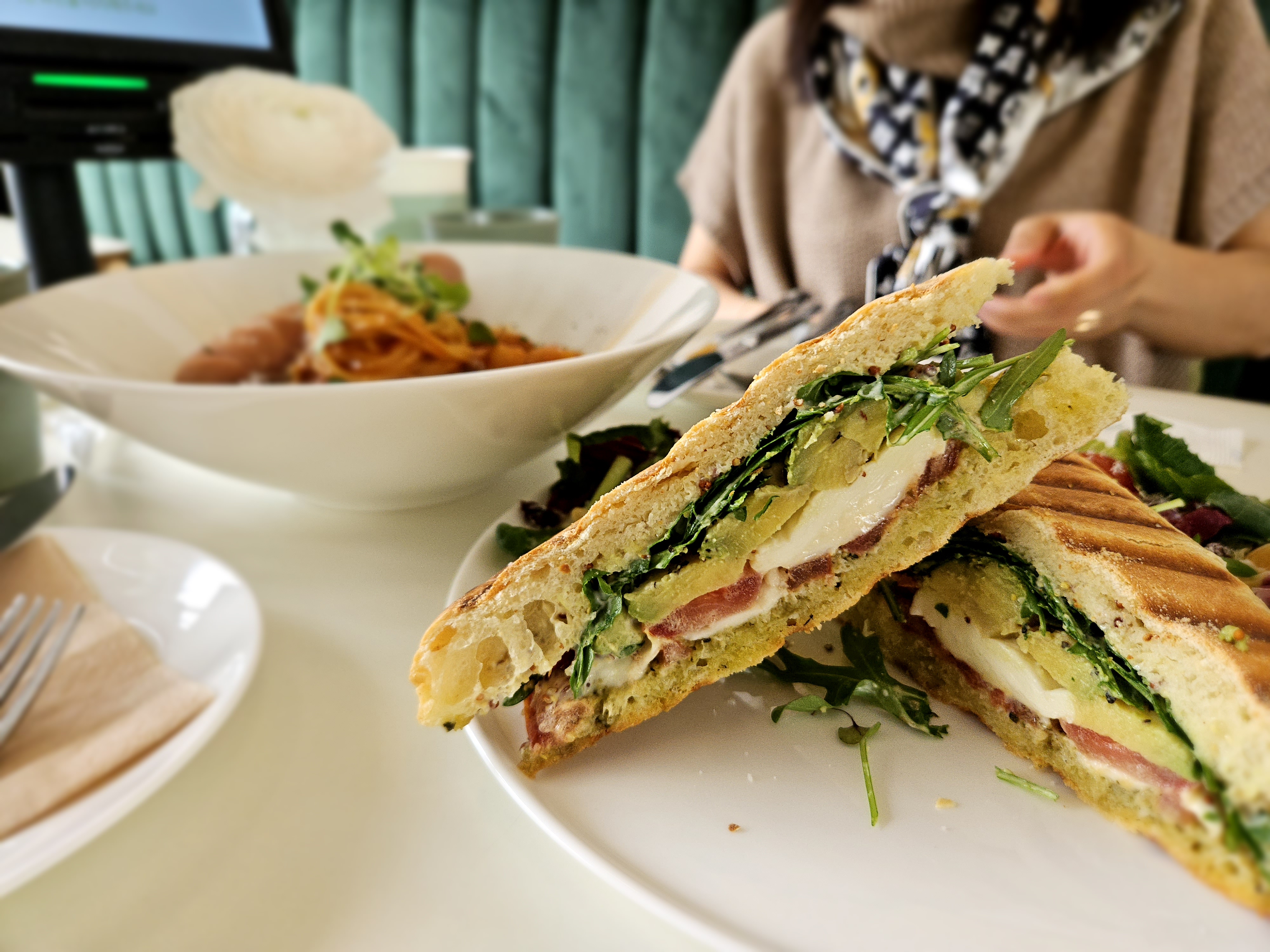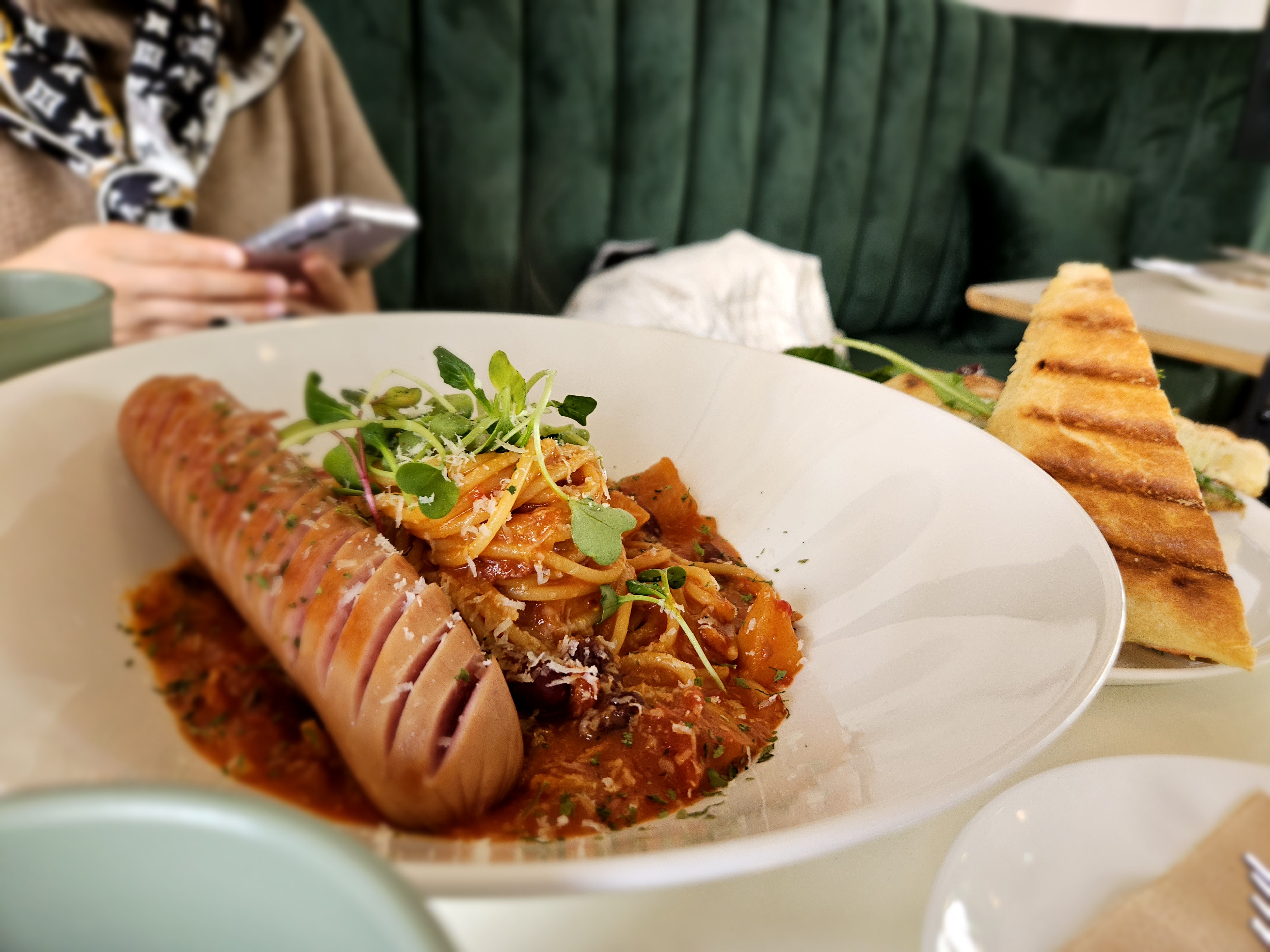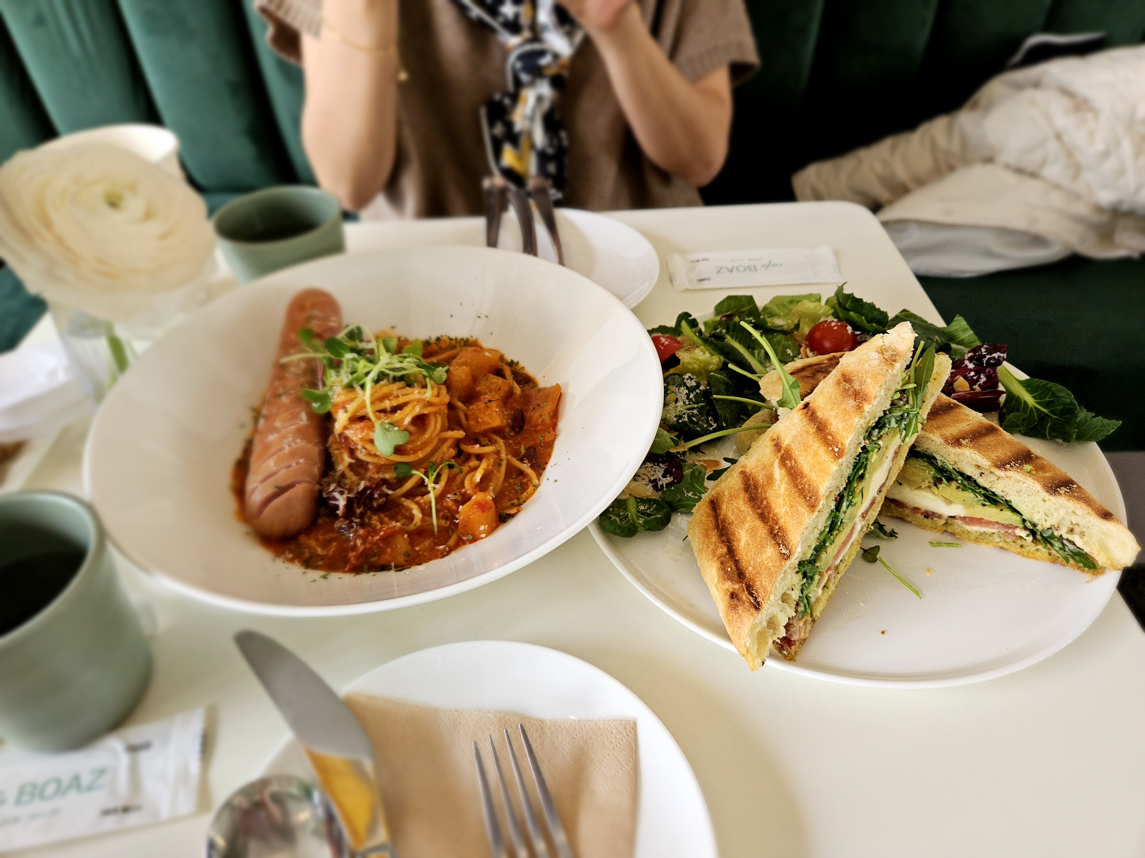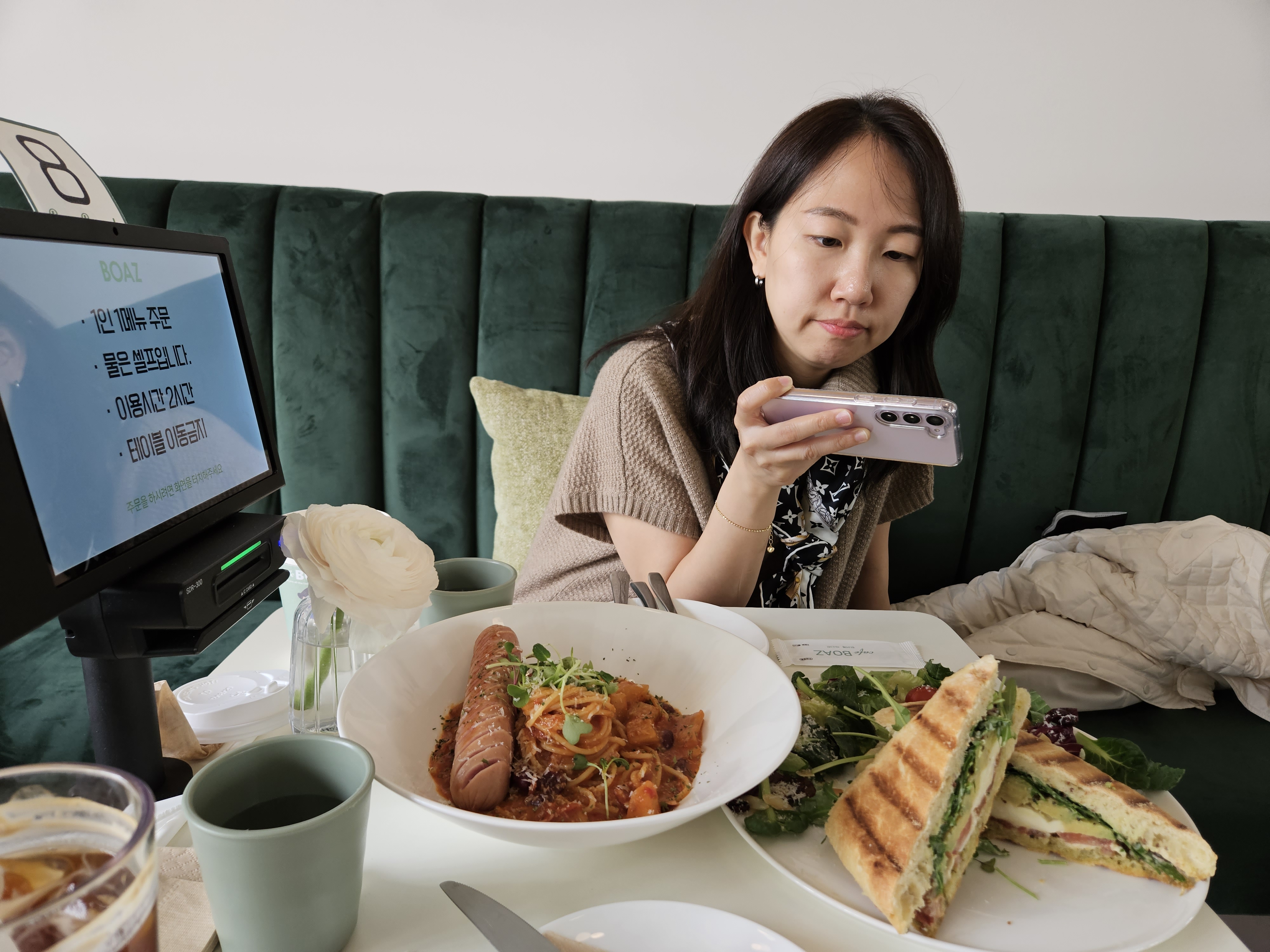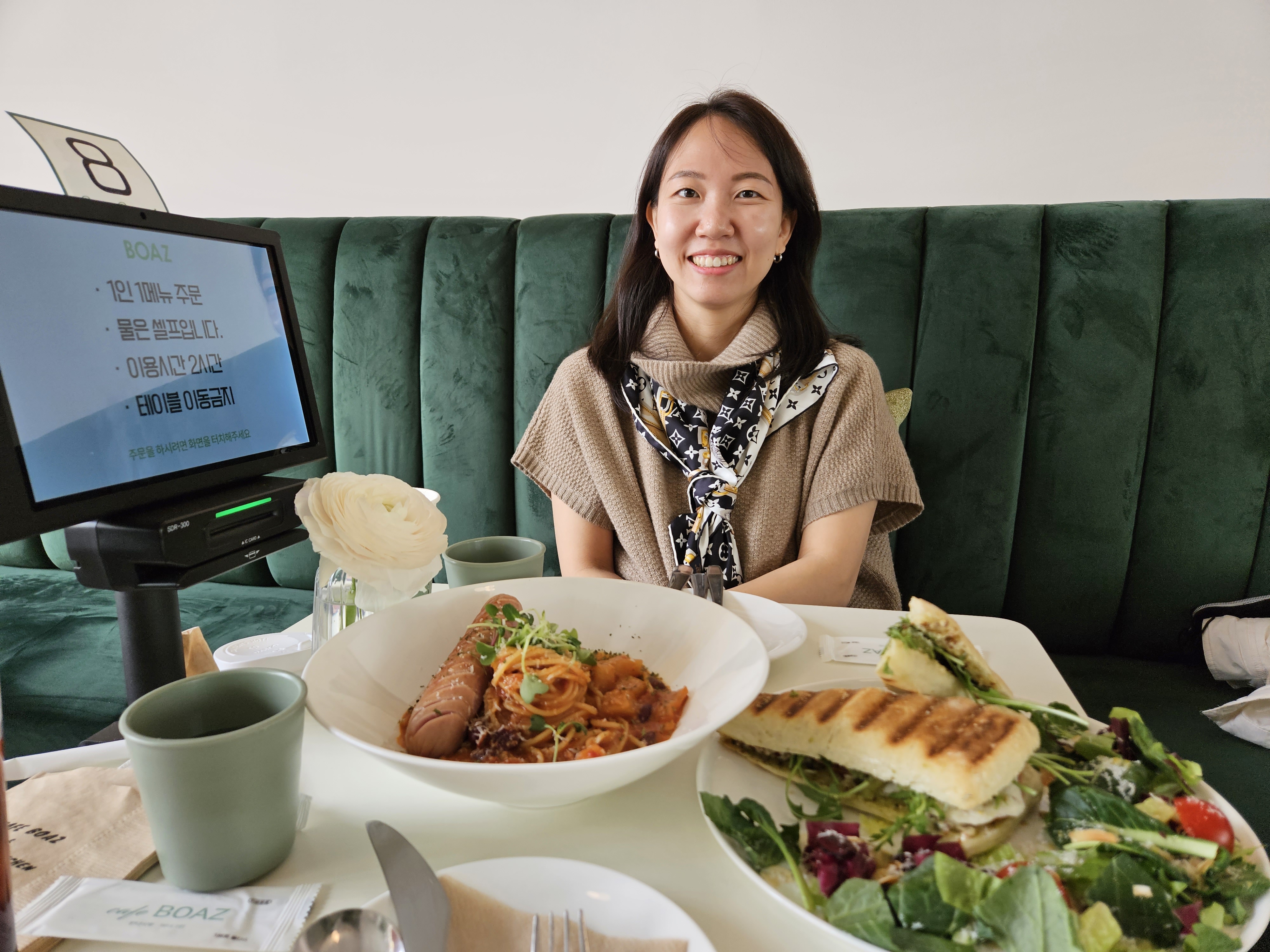 음식 주문은 카프레제 파니니, 매콤 초리조 파스타를 시켰다