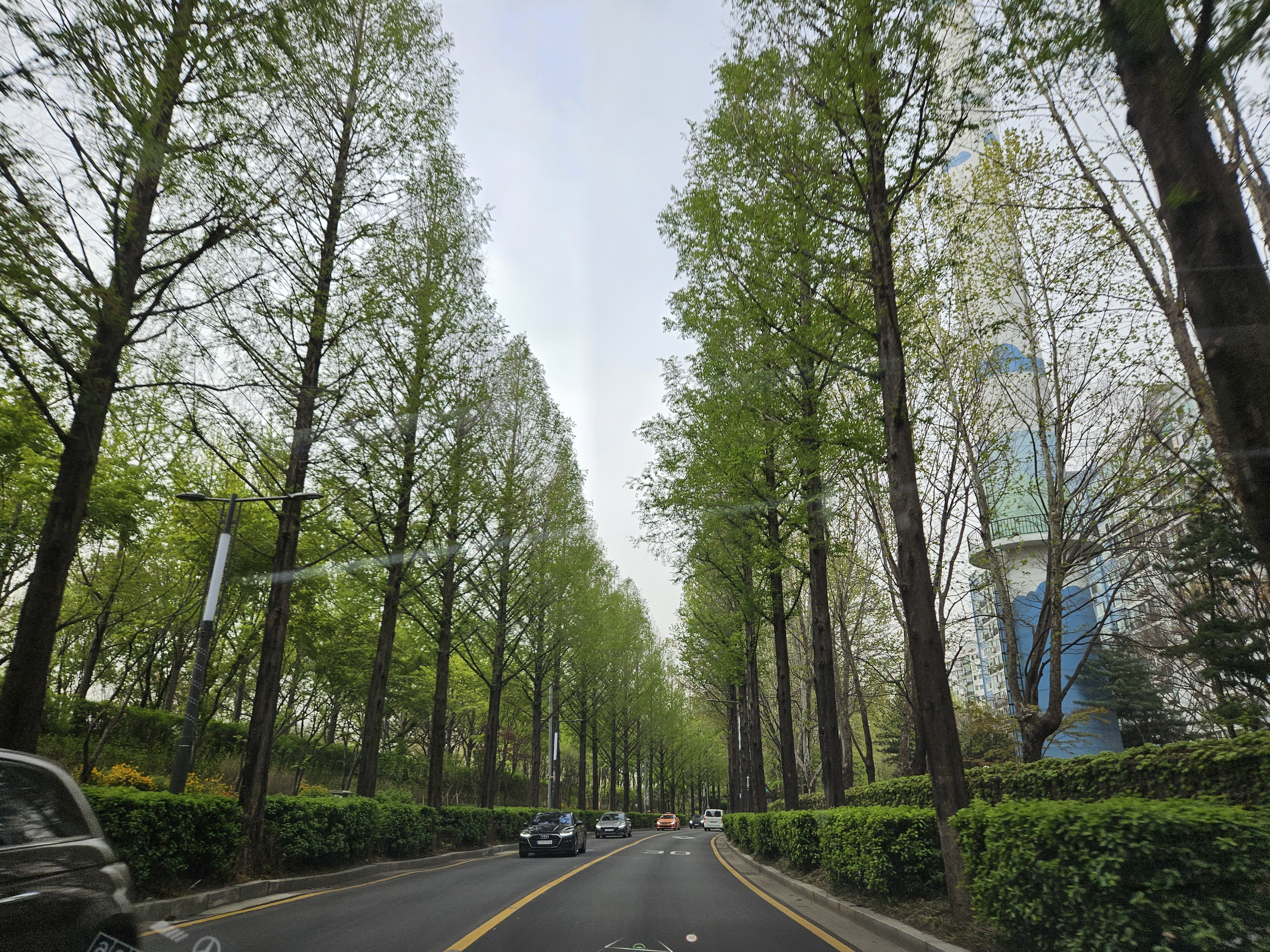 길 양쪽에 푸르른 키 큰 나무들이 멋진 모습을 보여주고 있더라