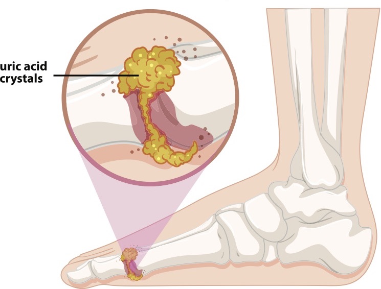 요산은 우리가 먹는 여러 음식이 소화되어 최종적으로 대사된 후 나오는 물질이며 보통 혈액 내에 녹아 있다가 소변으로 배출되나, 통풍 환자의 혈액 내 요산은 지나치게 많습니다. 이처럼 과다 축적된 요산은 결정체로 변하고, 이 요산 결정체가 관절 내에 침착하여 염증을 유발합니다.