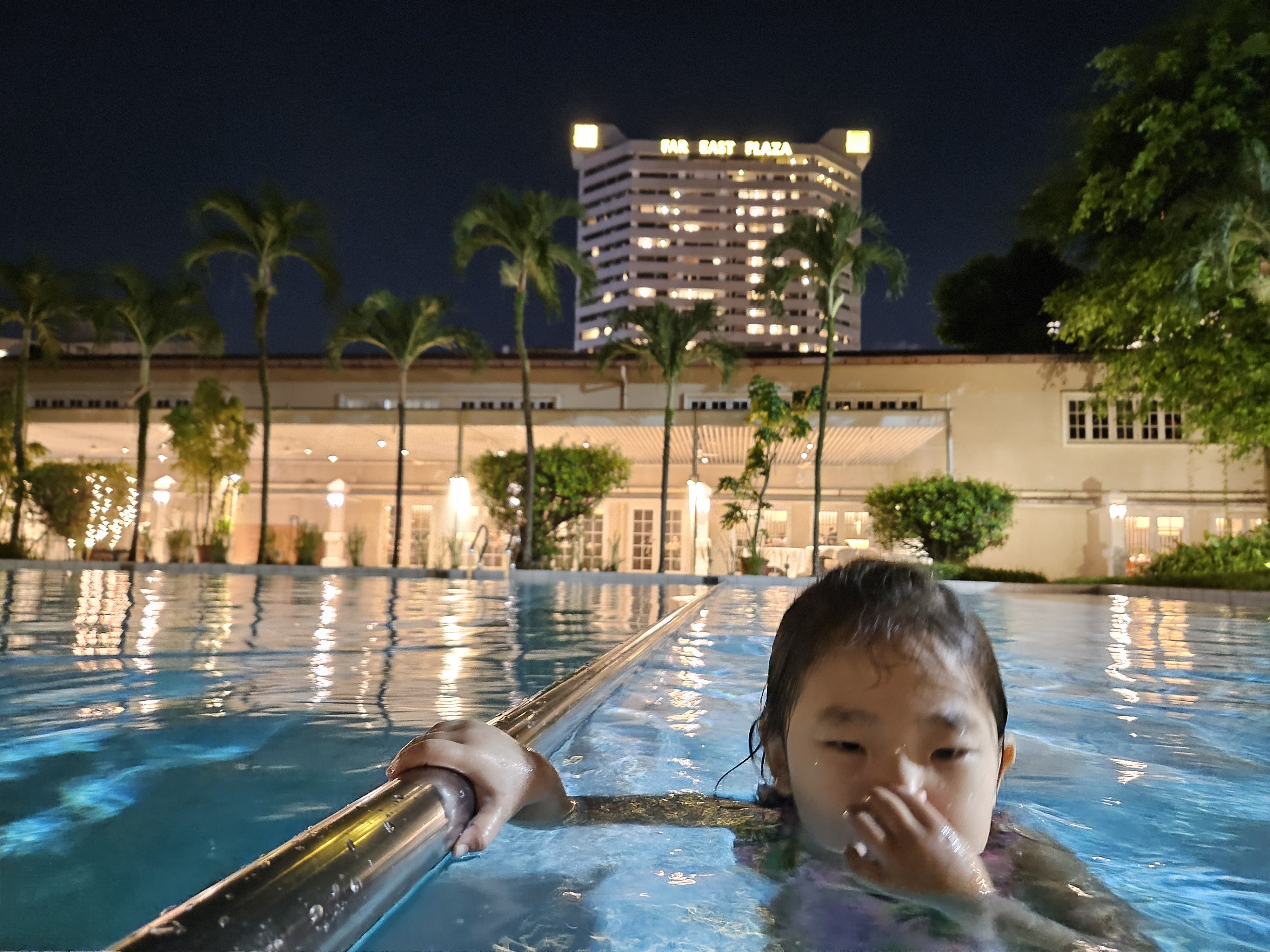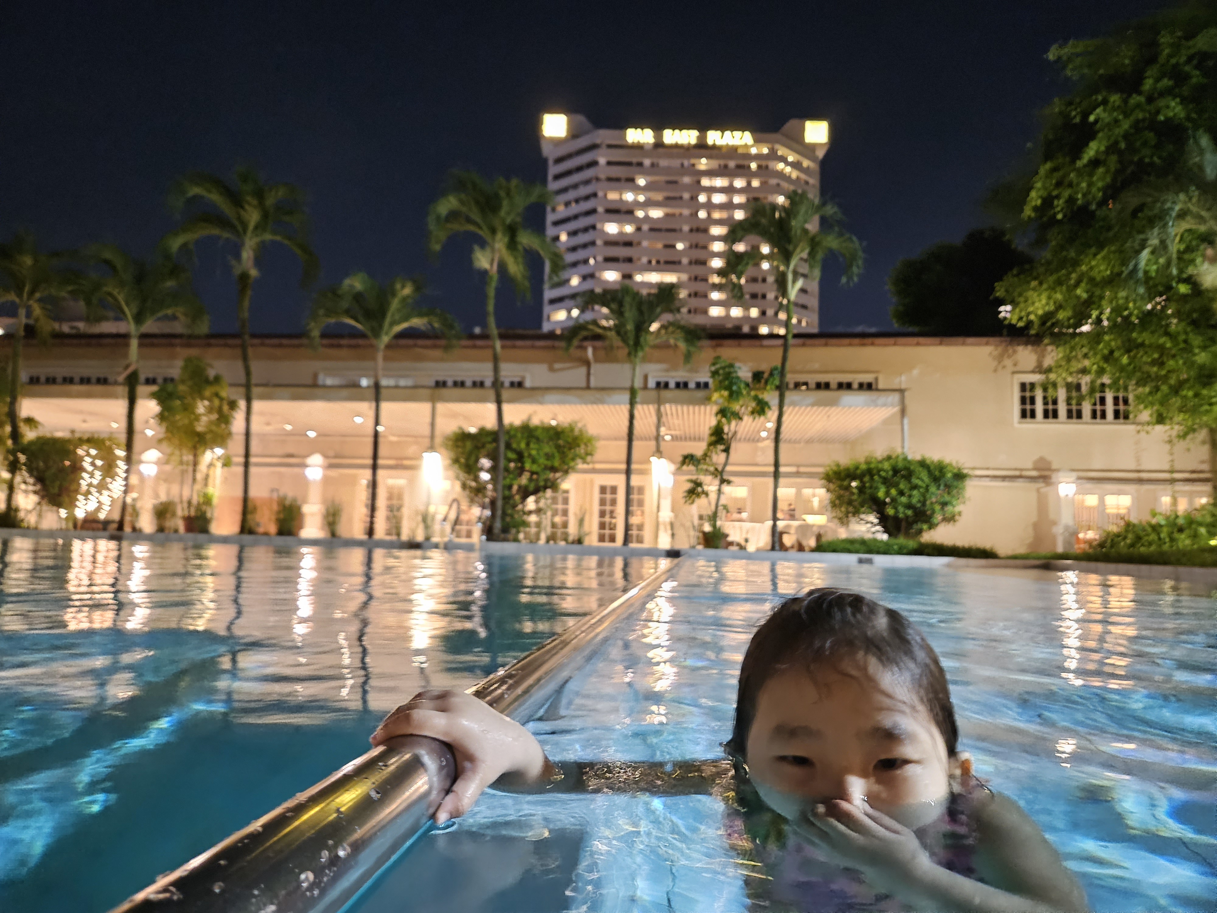 사온 저녁을 어디서 먹을까 하다가 수영장 옆에 있는 테이블에서 먹어 보기로 하였습니다.