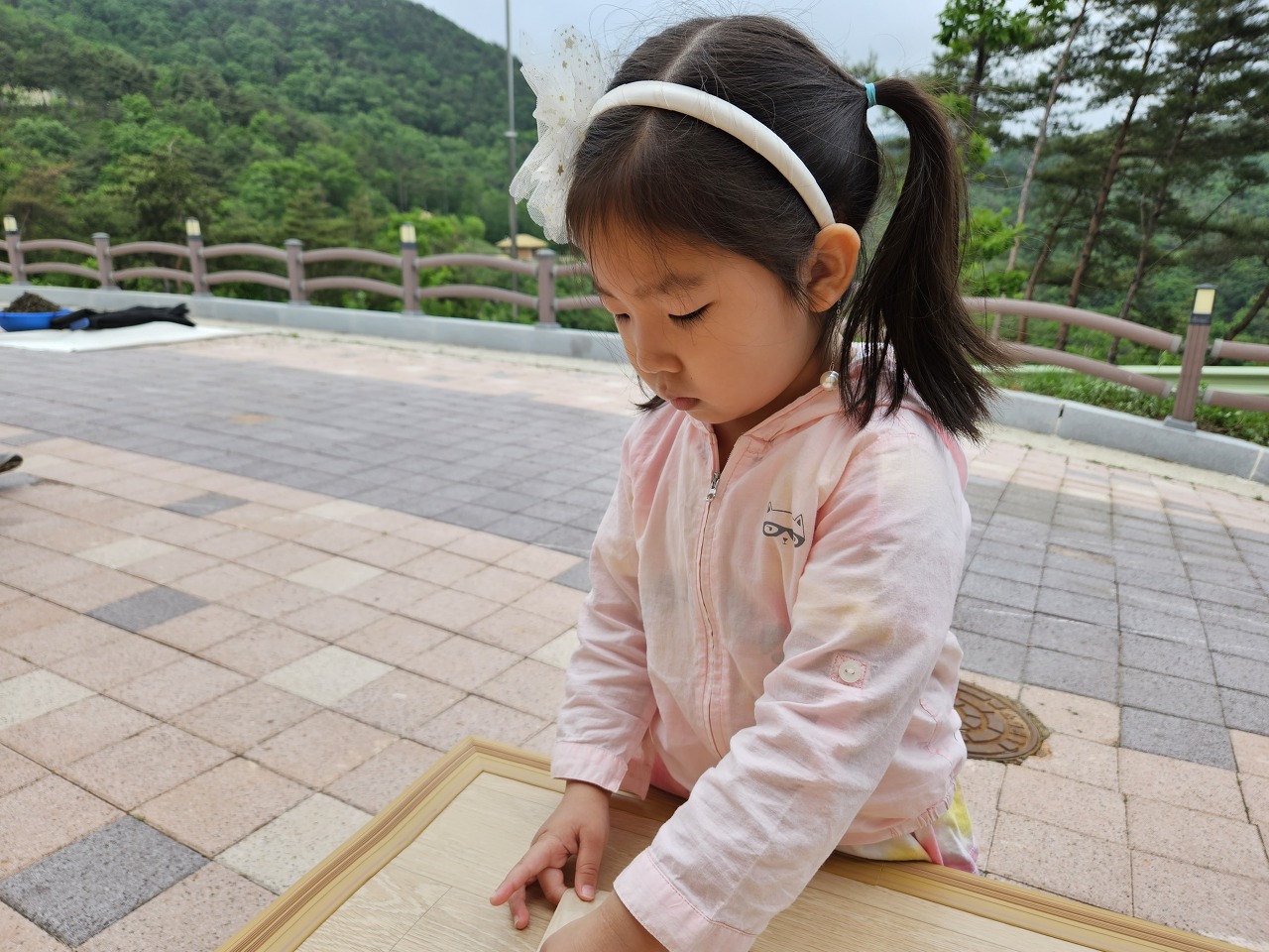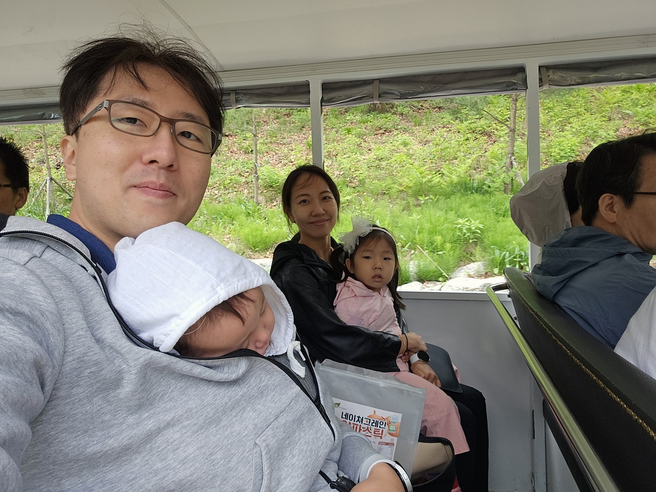 밥 먹고 전기투어 버스 기다리며 휴지로 접기 놀이를 하고 있습니다.