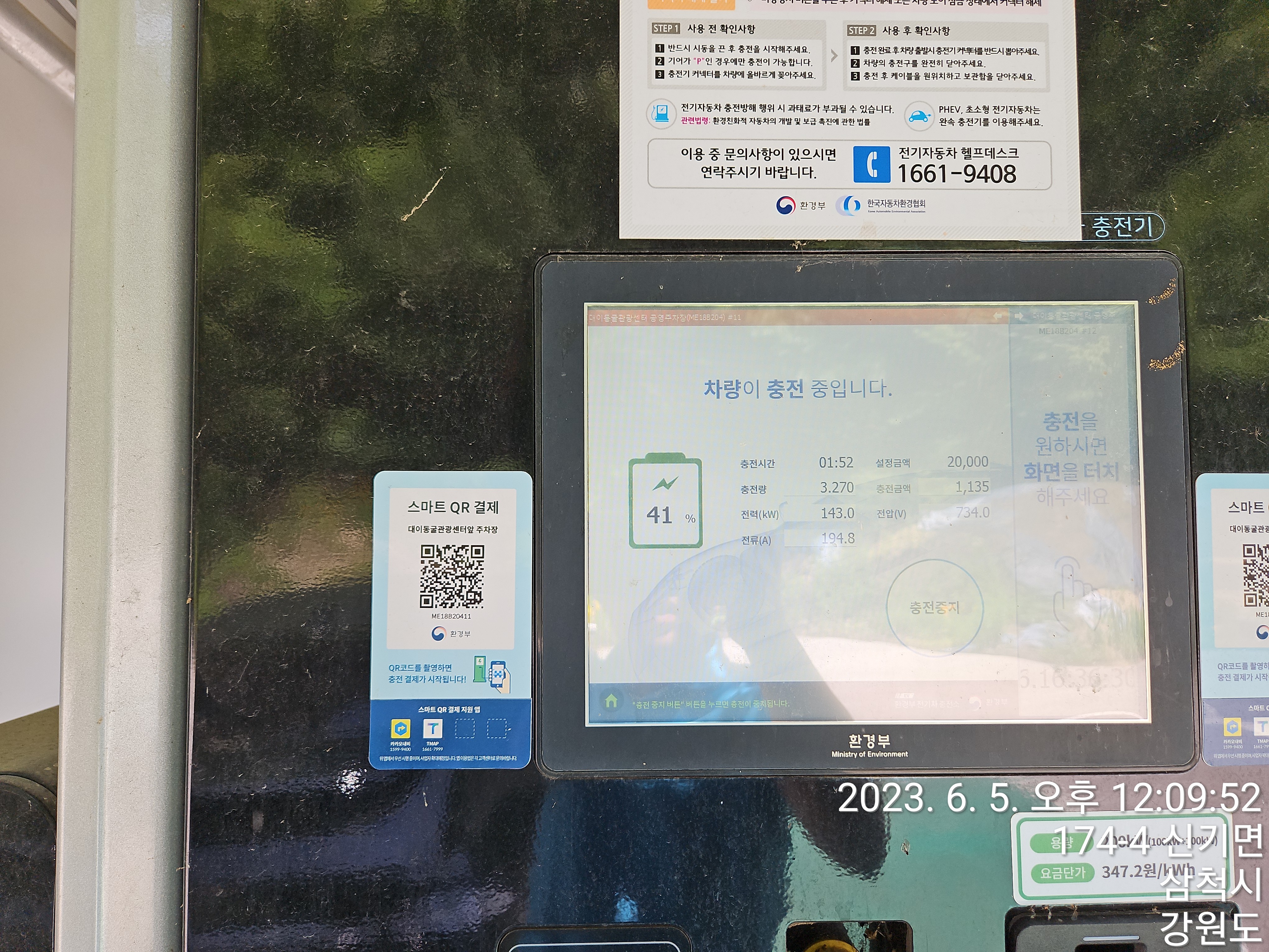 와이프랑 아이들이 자길래, 환선굴 주차장에 있는 급속충전기에서 충전도 해봤는데, 편리하고 빠릅니다.