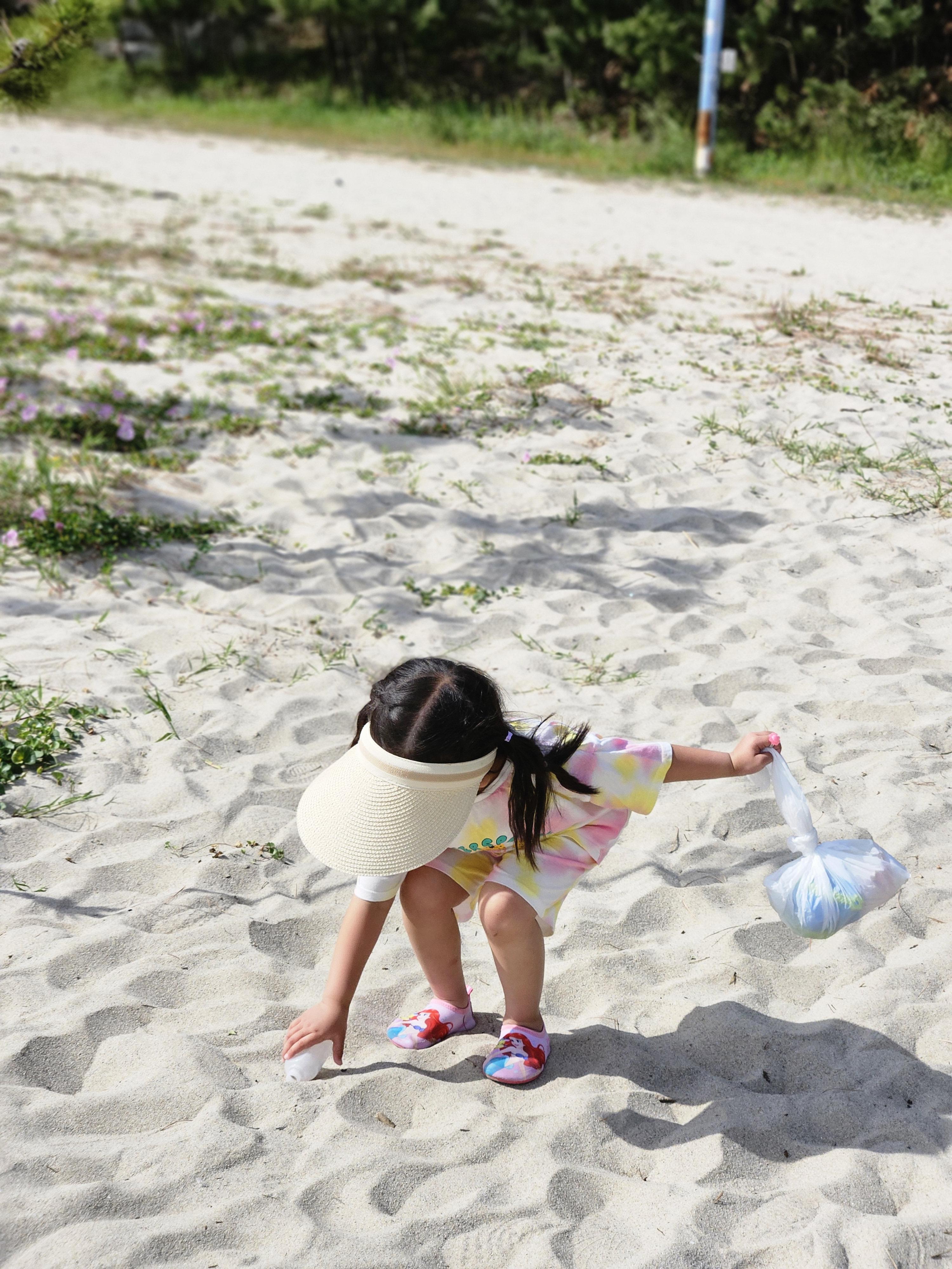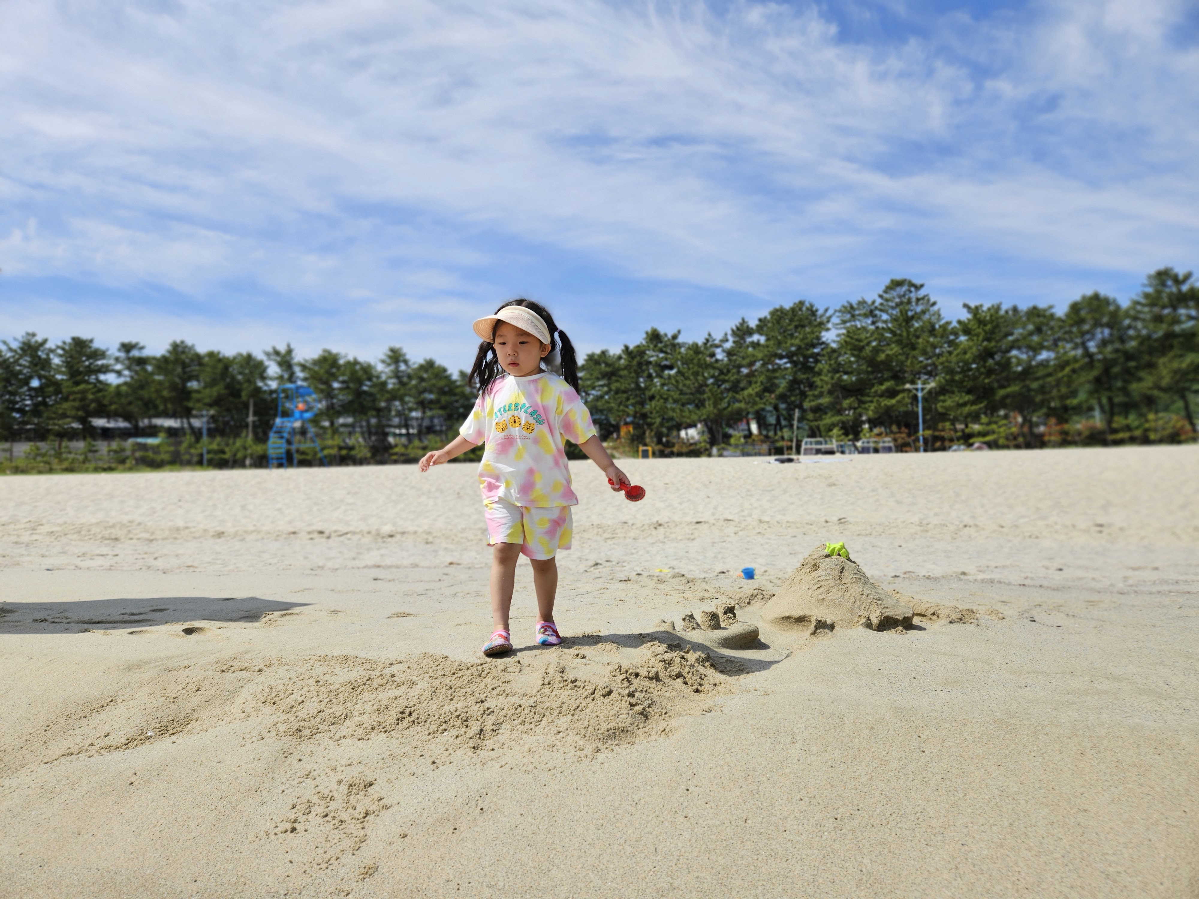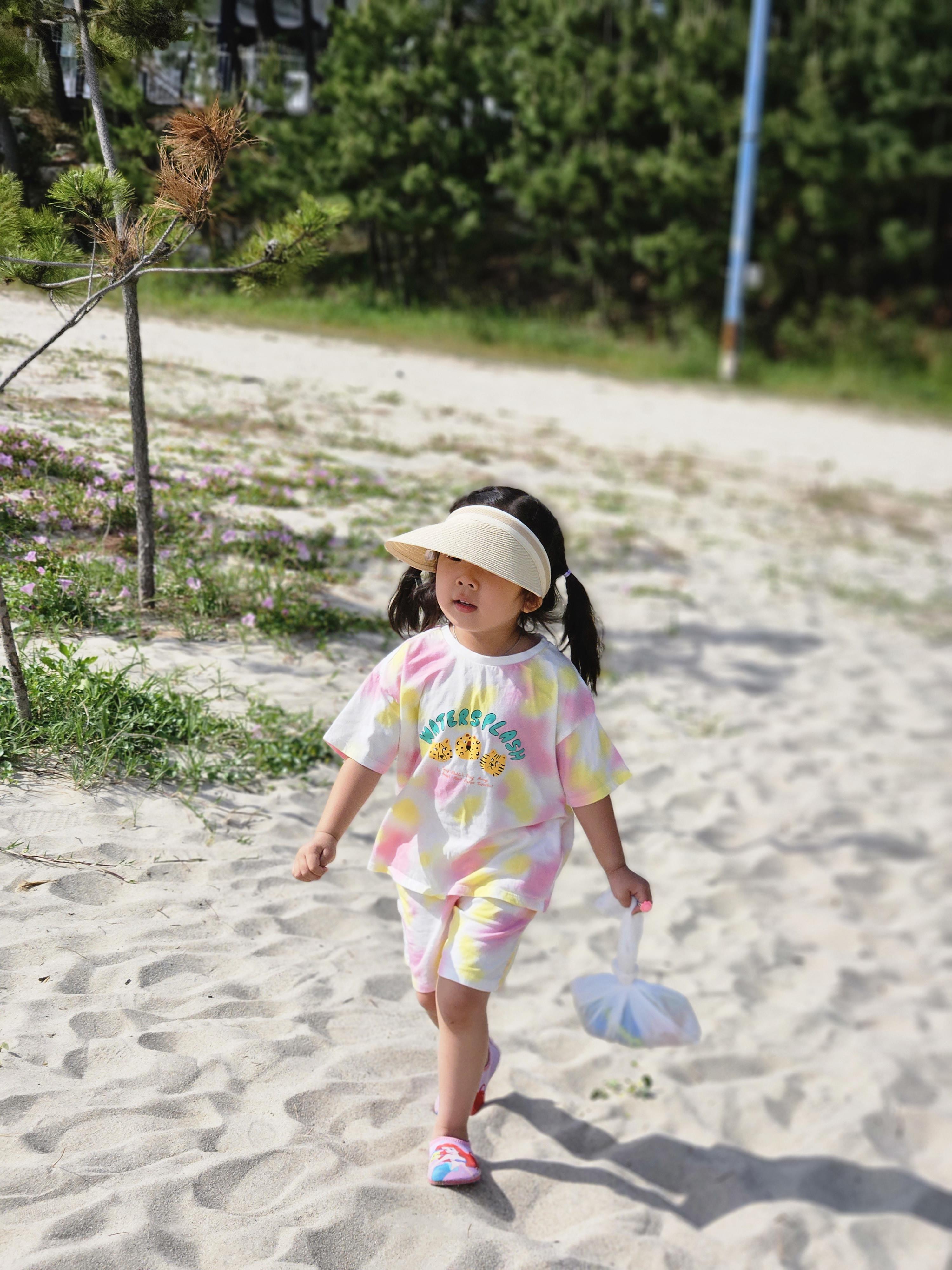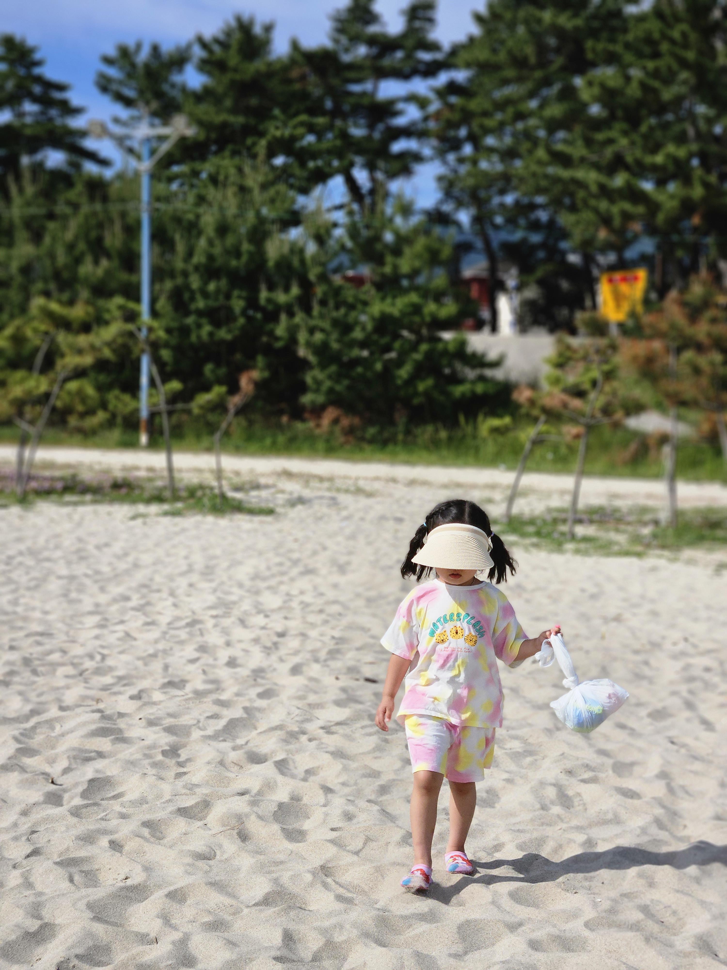모래 놀이 세트를 들고 열심히 걸어가봅니다.