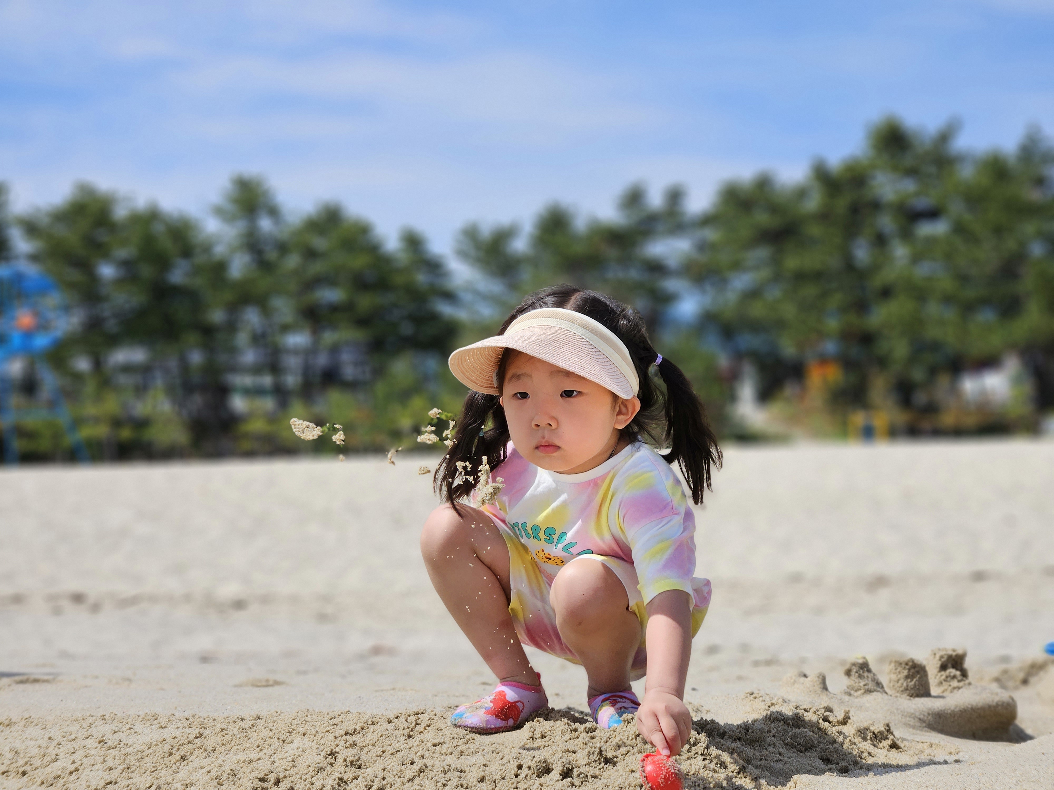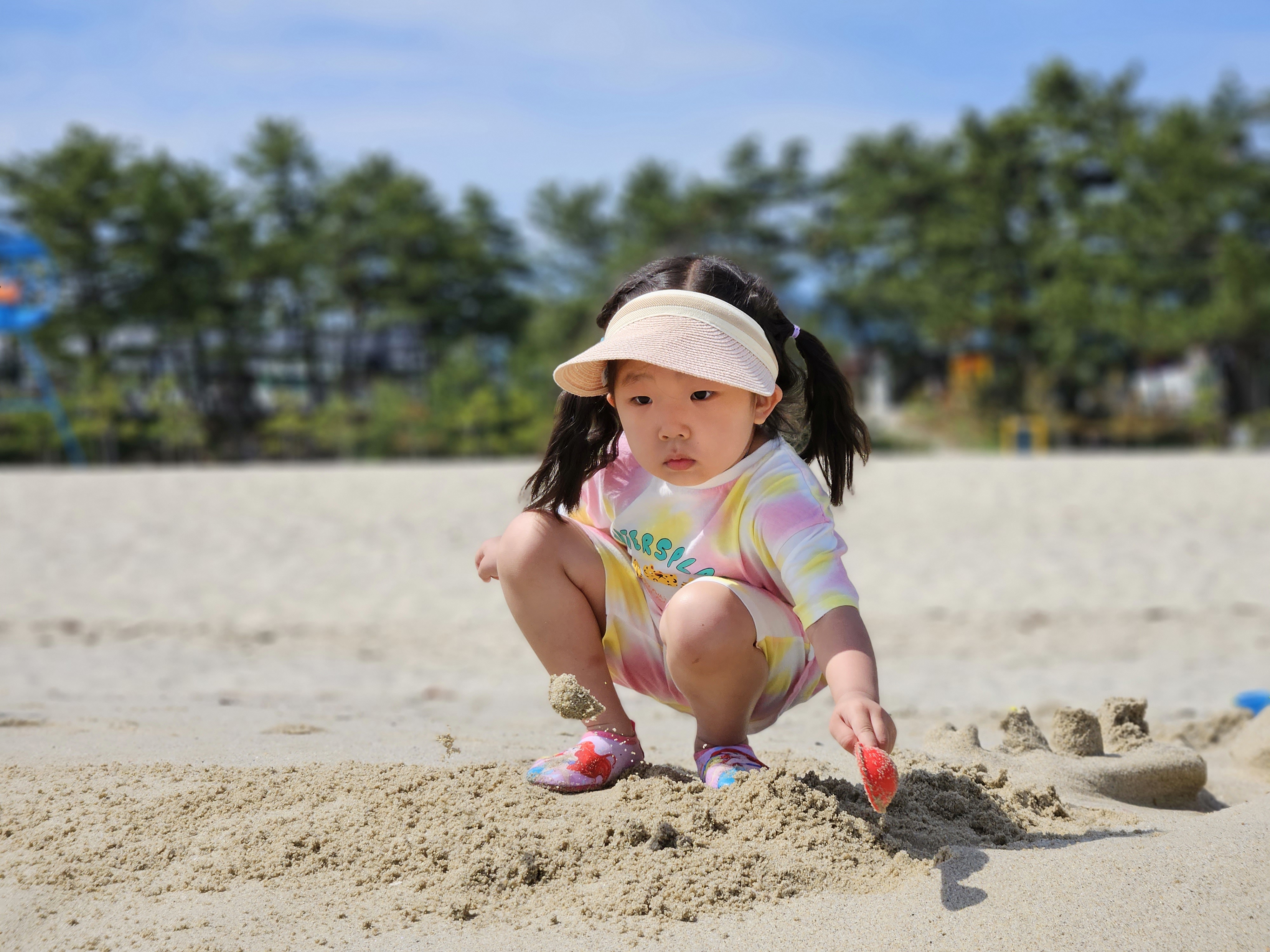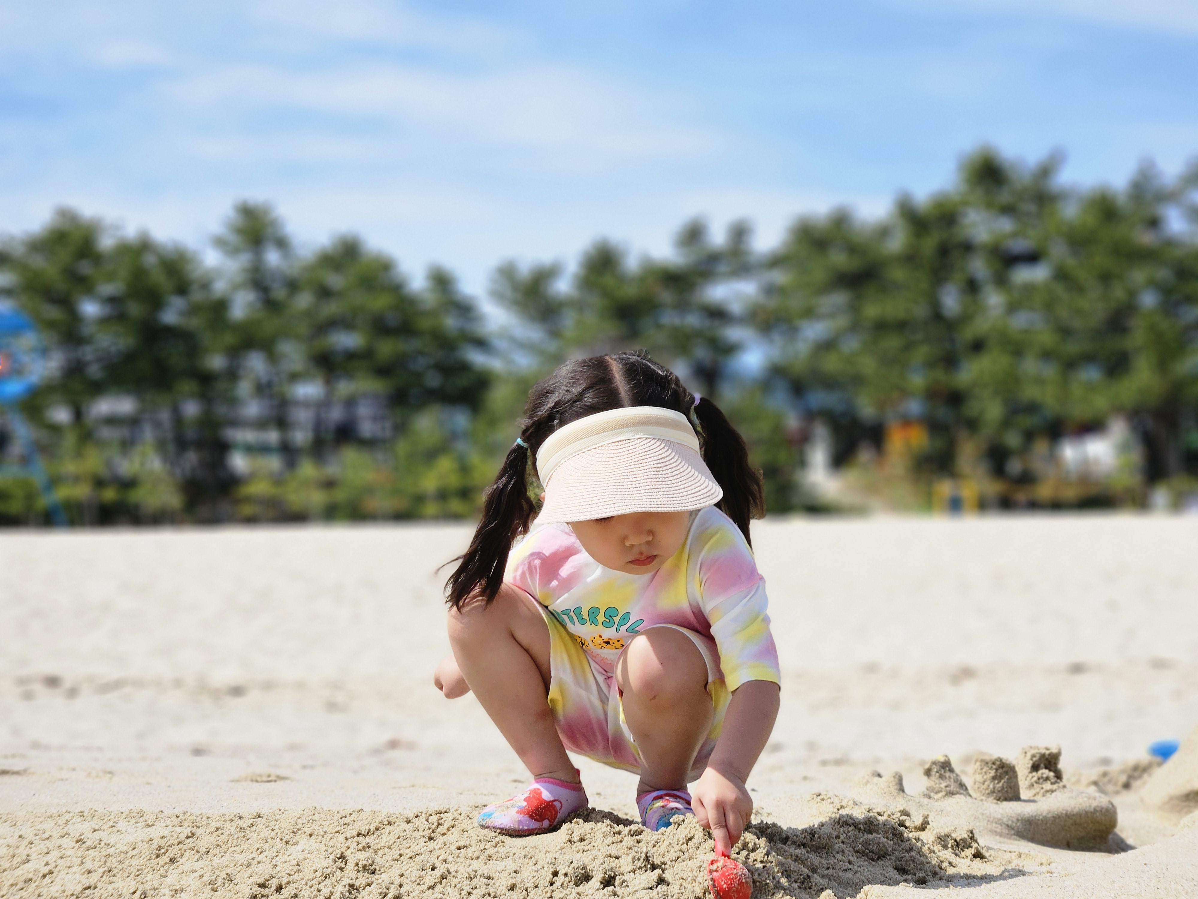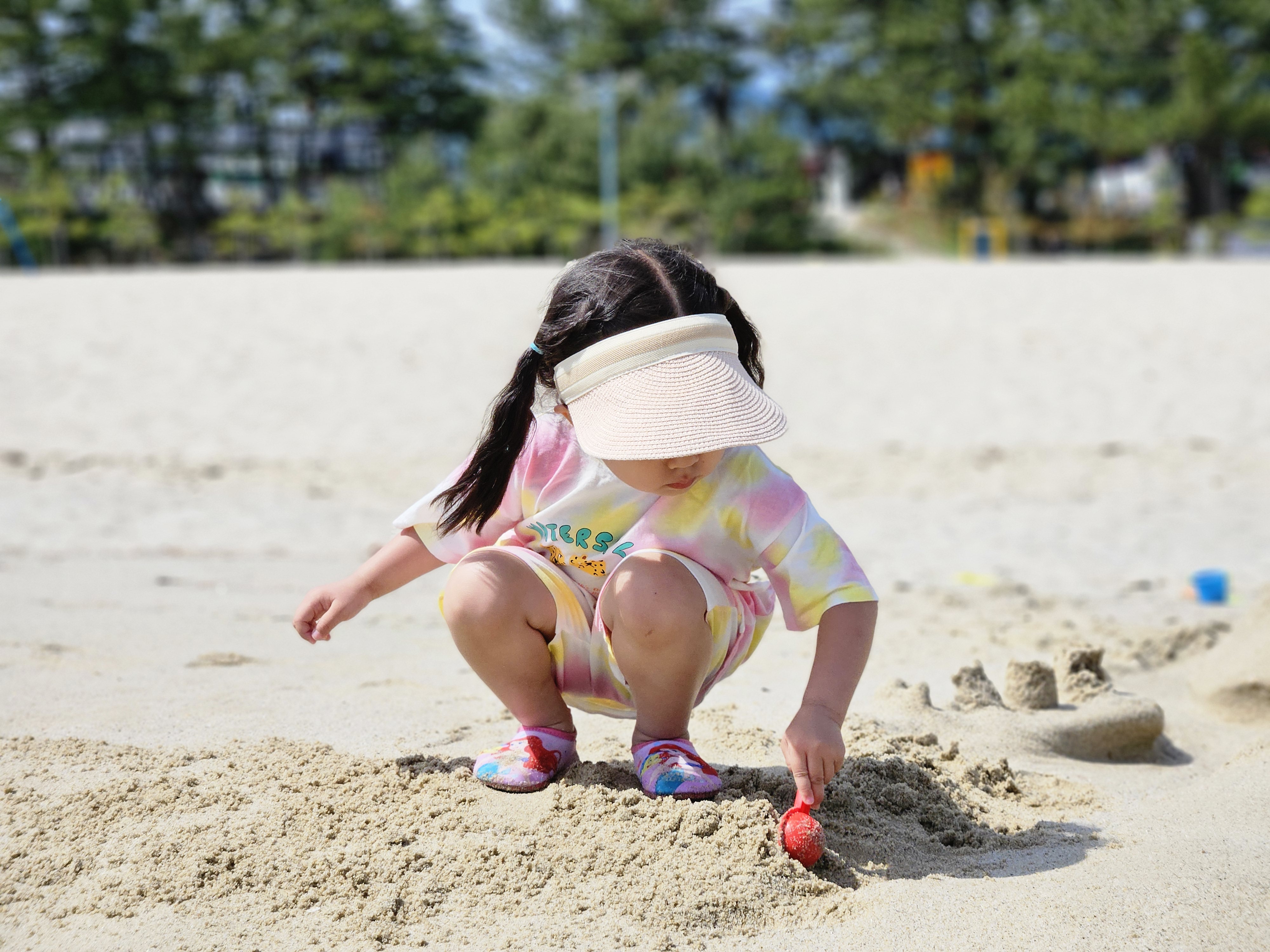 모래 놀이 세트를 들고 열심히 걸어가봅니다.
