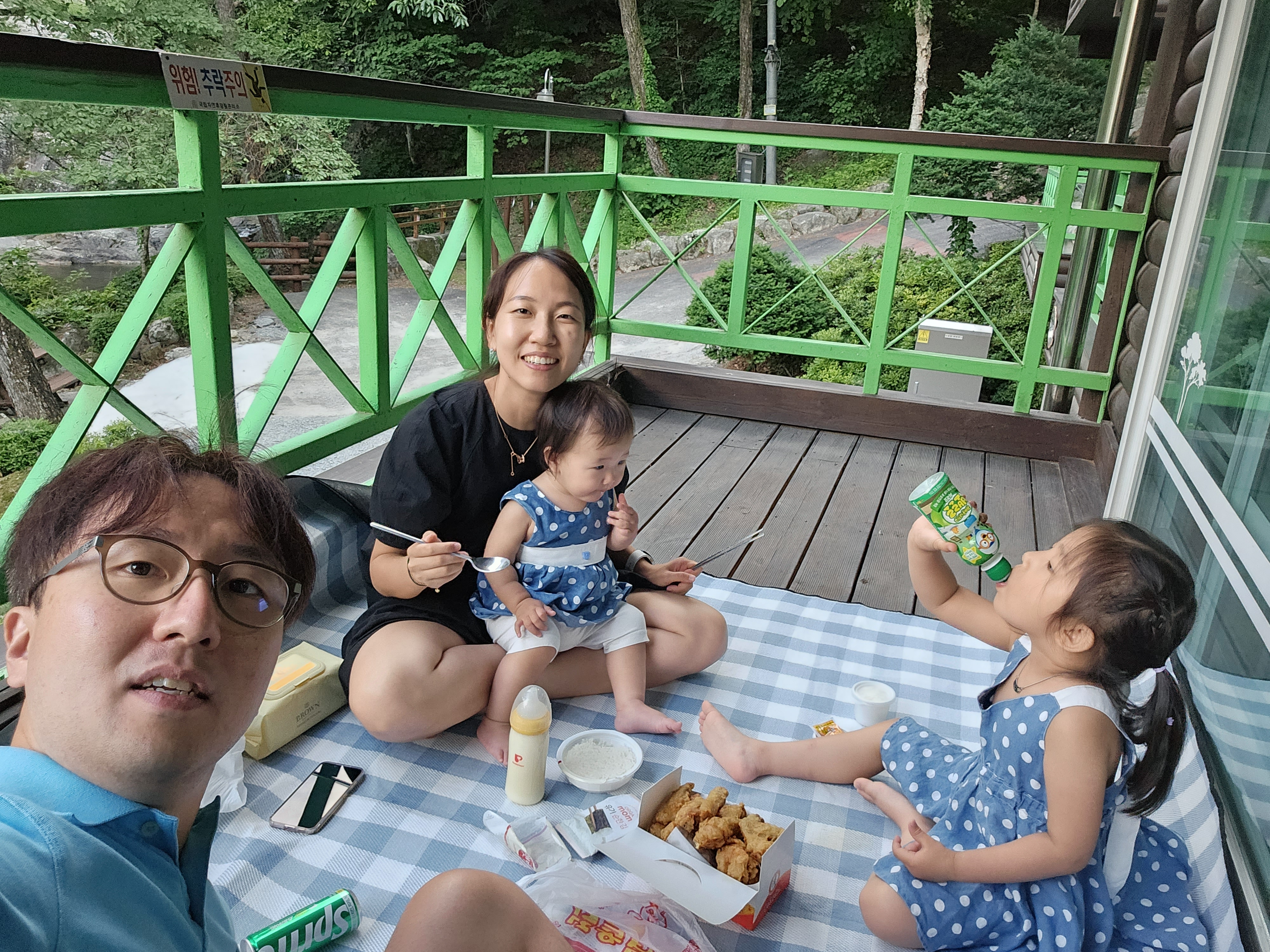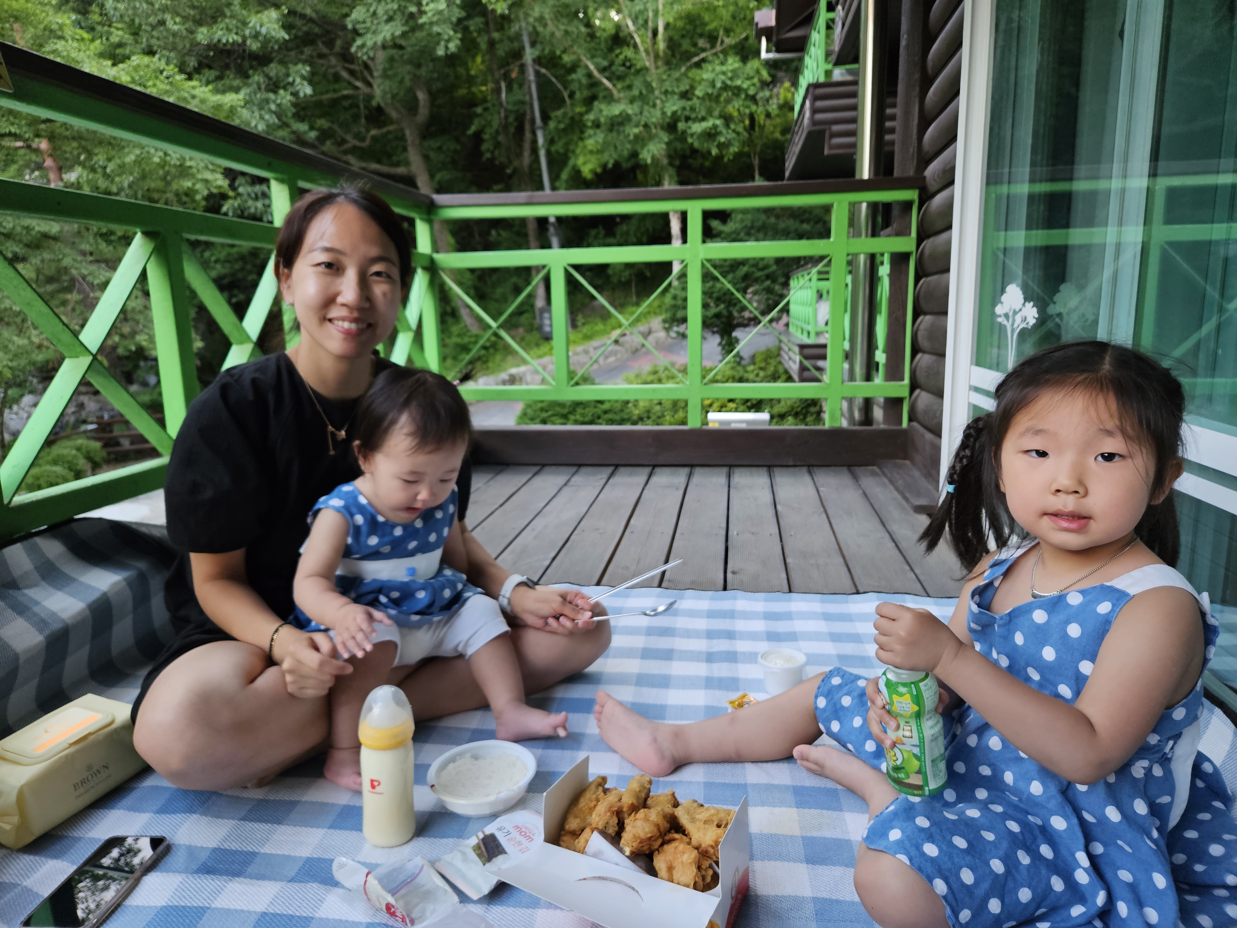 밖에 나가서 테이블에서 먹으려고 하였으나, 사용을 하지 못하게 되어있어서 베란다에 돗자리를 깔고 먹기로 하였다