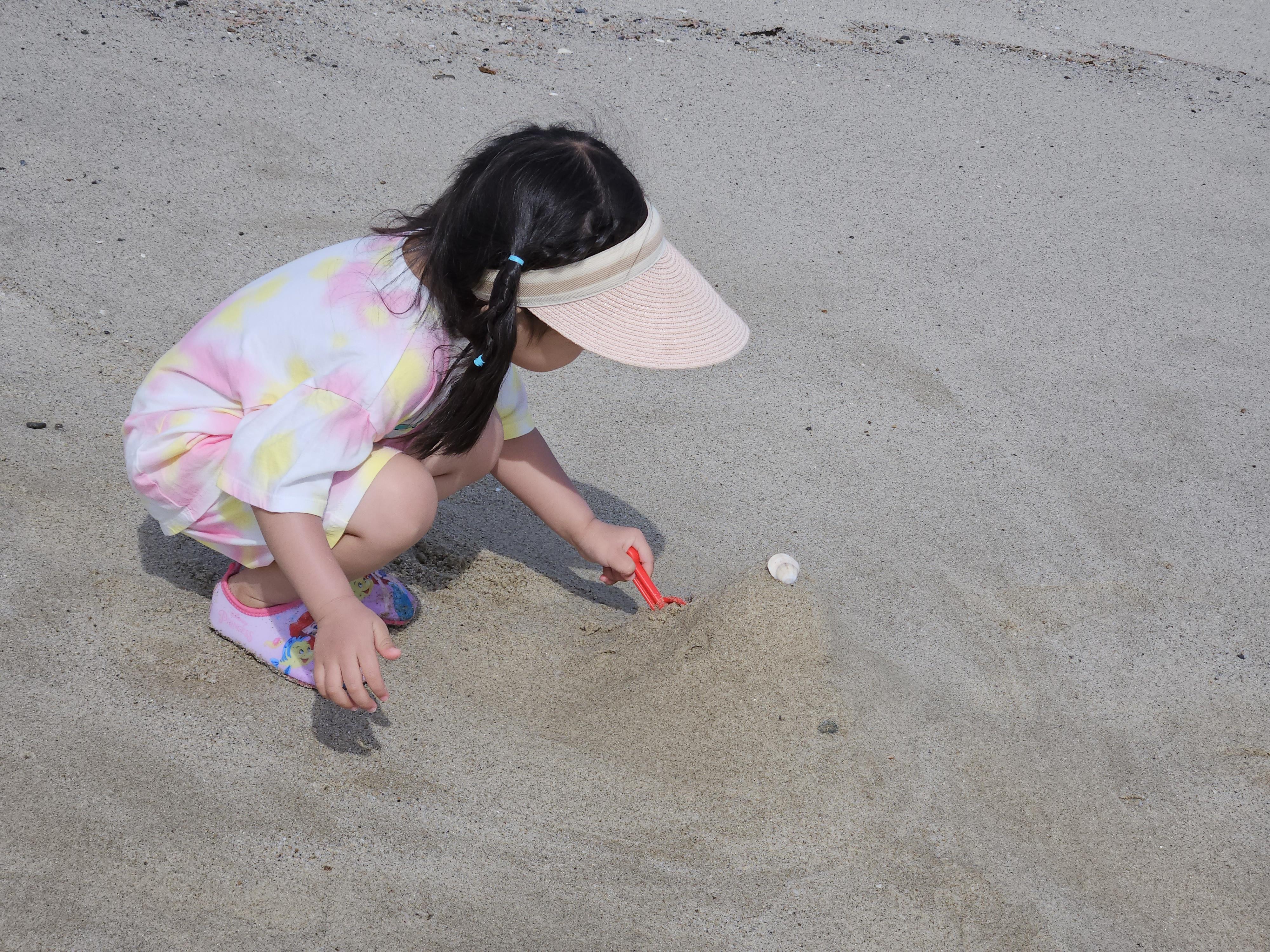 모래로 산을 쌓고 조개껍질 하나 올려봅니다. ㅎㅎ