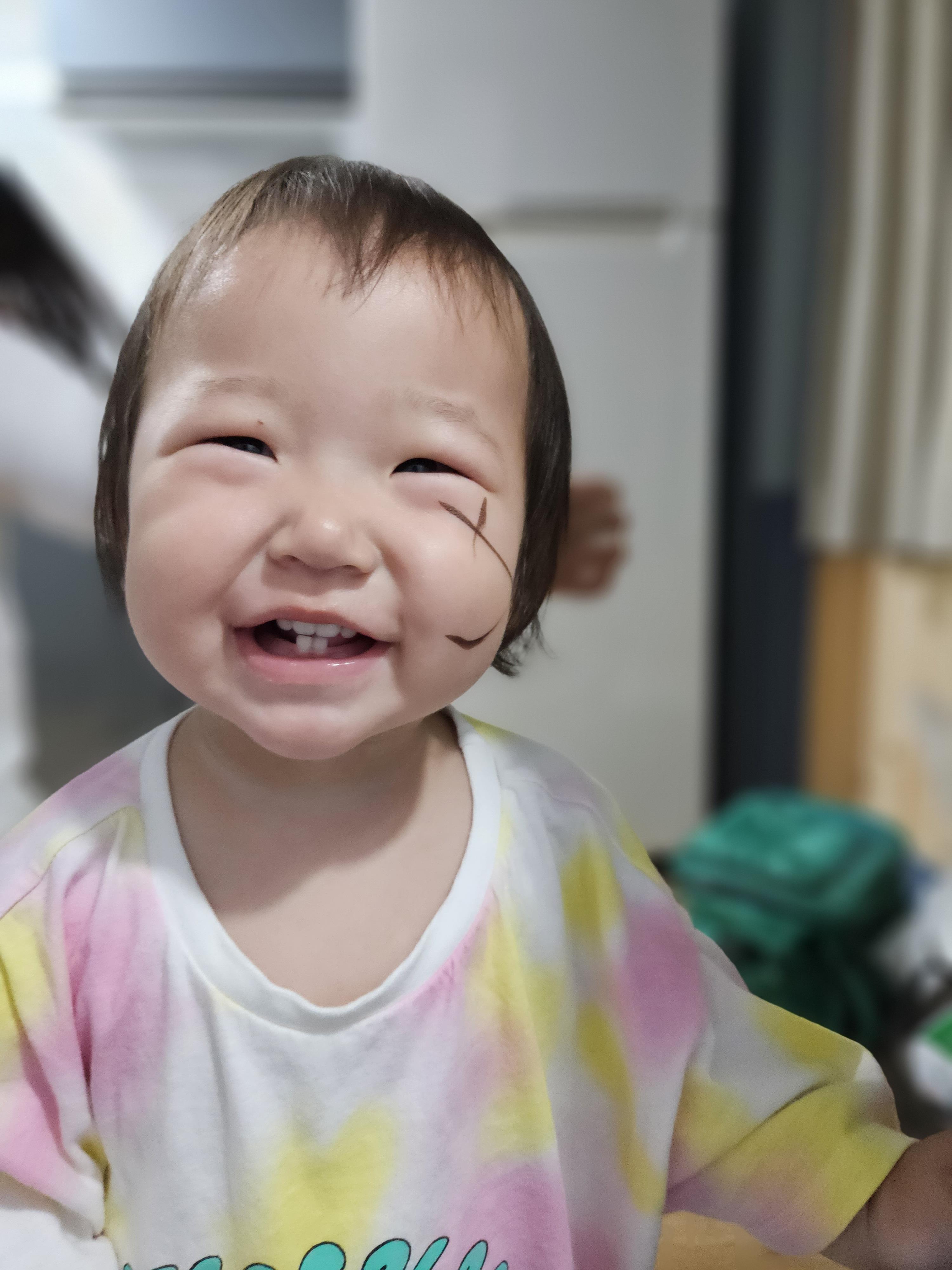 엄마 화장품으로 얼굴에다 이렇게 장난을 쳐 놓았네요..