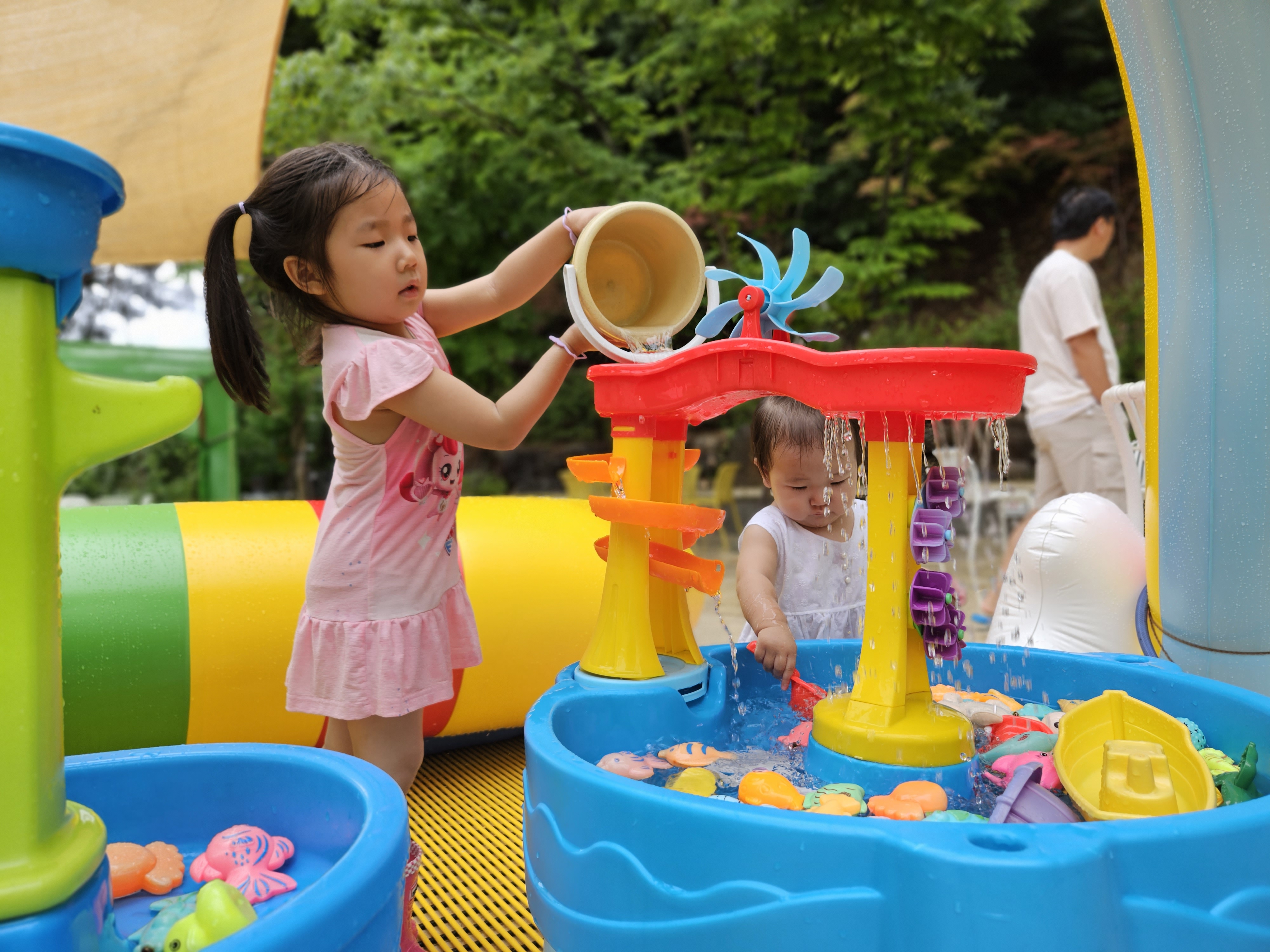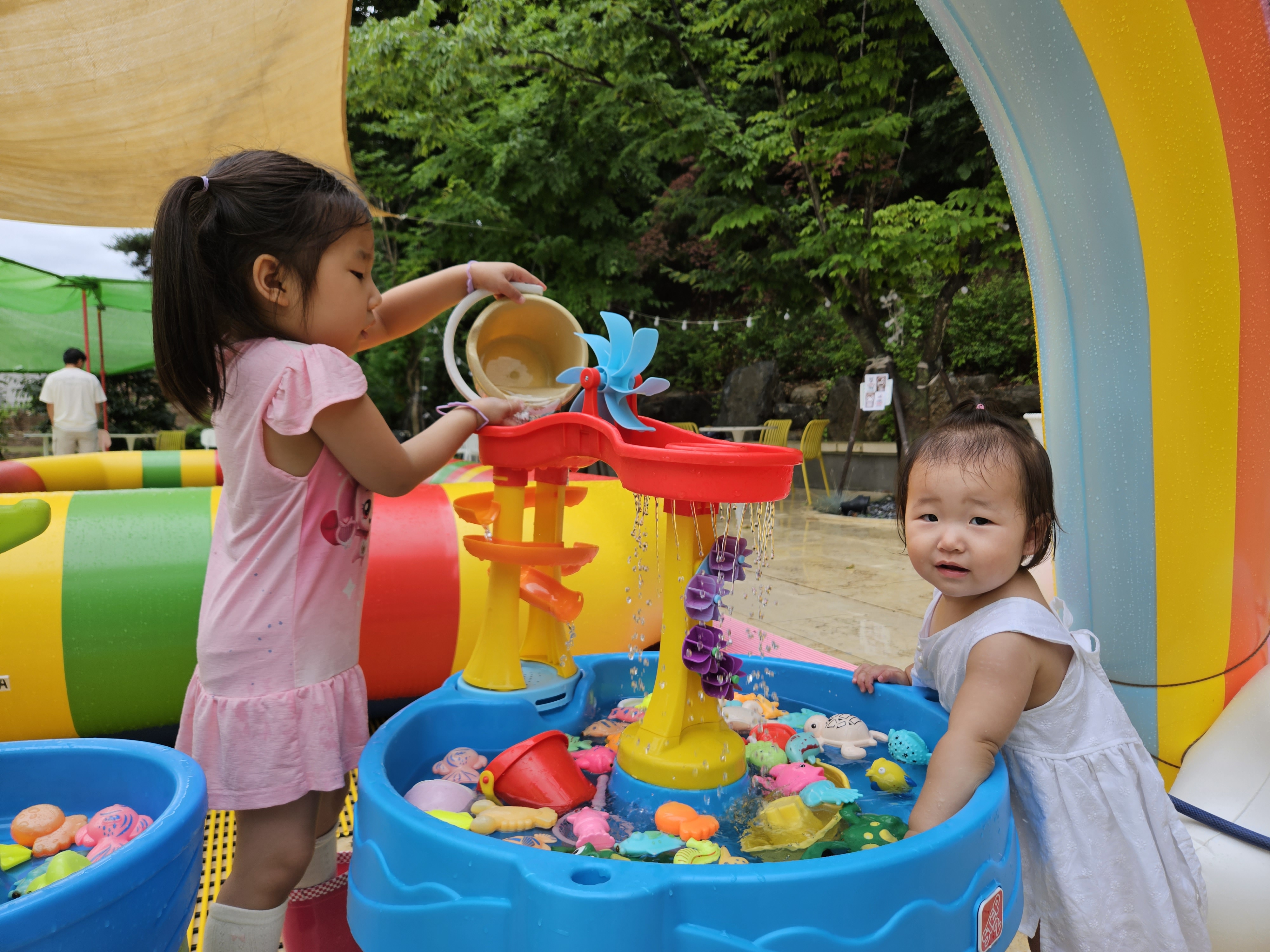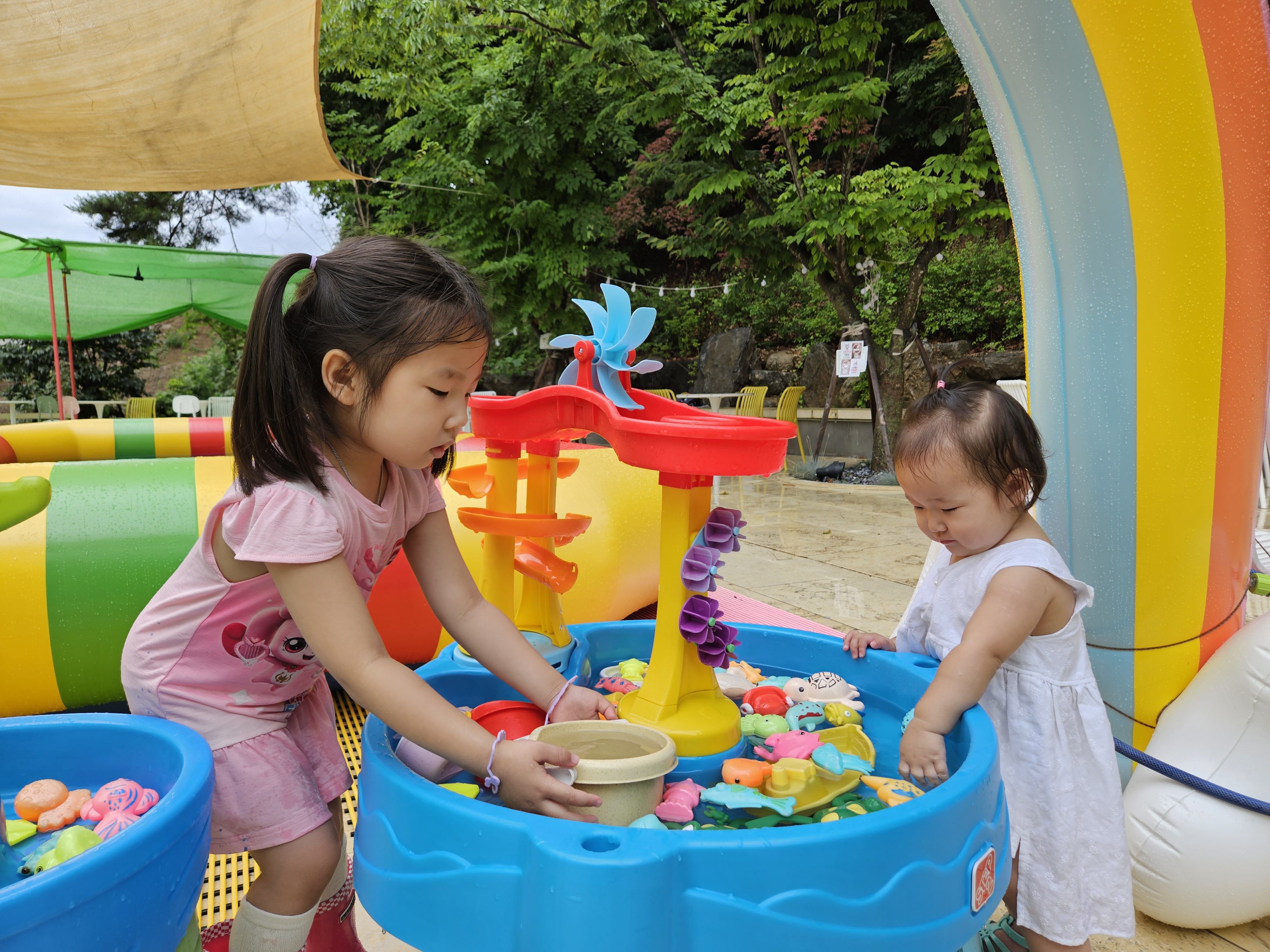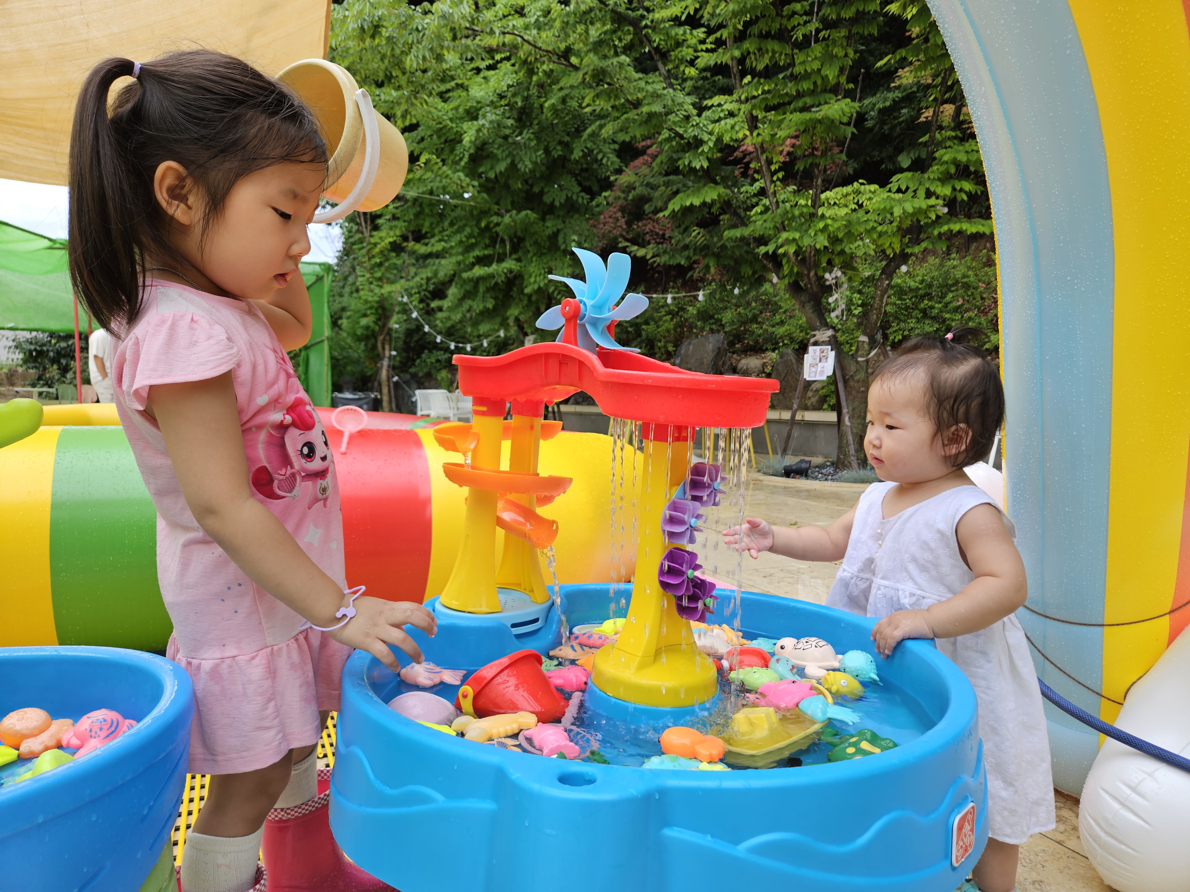 물통에 물 채워 물을 부어주는 언니 도연이..