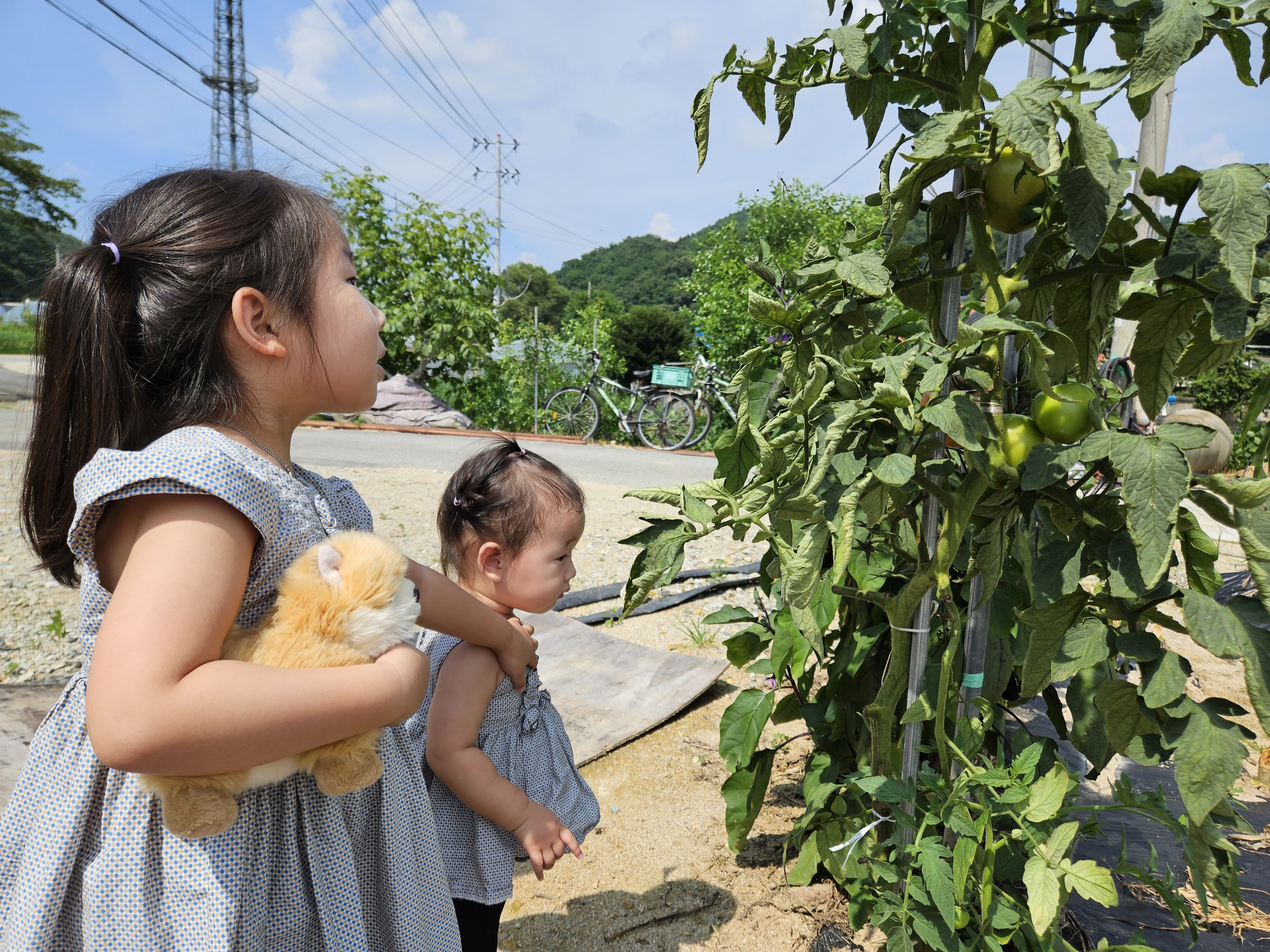 어린이 집에서도 토마토를 심어 보았지만, 조그마한 토마토 보다가 큰 토마토가 매달려 있는 것을 보니 신기한가보다.