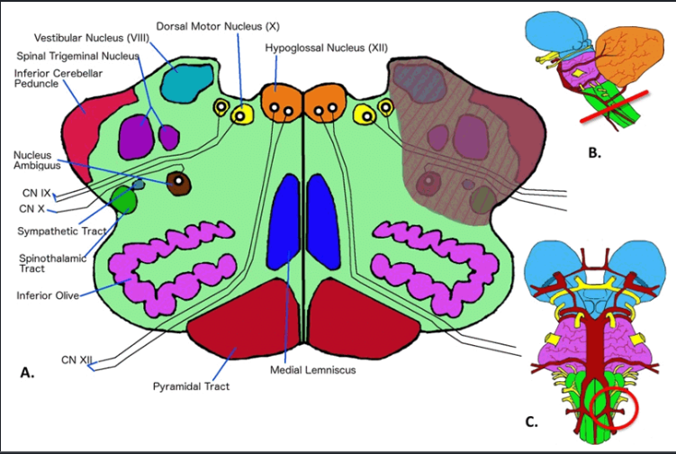- nucleus ambiguus - ipsilateral laryngeal, pharyngeal, palatal hemiparesis (dysphagia, hoarseness, gag reflex dec) : CN X