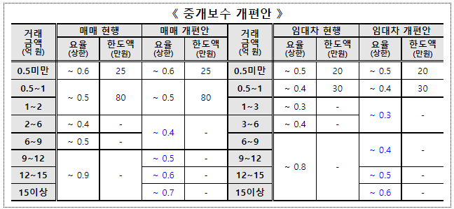 10억 매매 시 400만원 중개보수 인하, 매매·임대차 역전현상 해소, 중개사고 시 손해배상책임 보